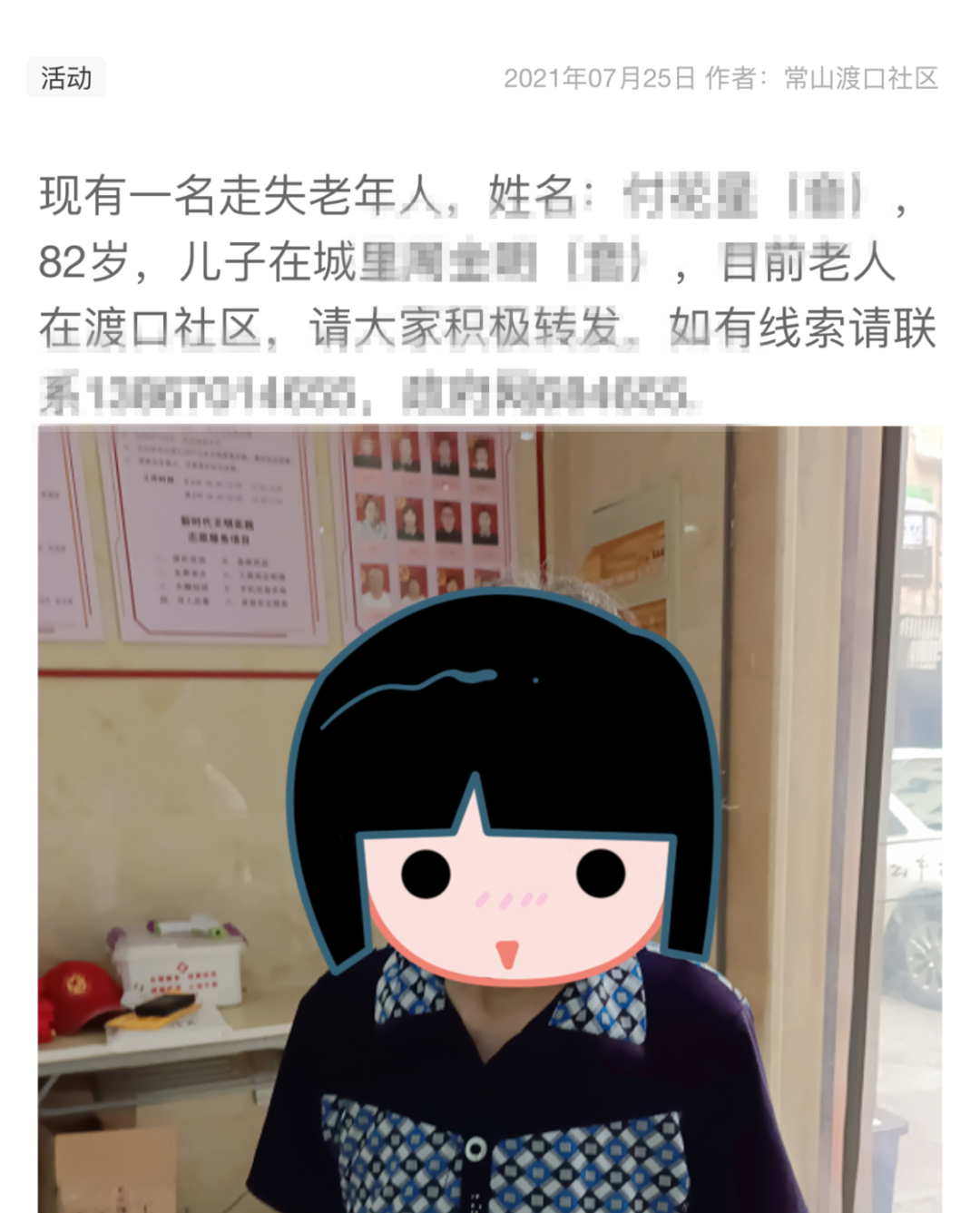 7月25日上午9时许,常山县城内有一名老年人迷路,被好心人带到了天马街道渡口社区。经询问,老人今年82岁了,儿子在城里上班。当前正是防台防灾的节骨眼上,走失的老人如果找不到自己的家人,那是何等的危险,家人又是何等的焦急……为此,渡口社区妇联副主席徐琼莉和其他社工,在微信群广泛宣传并及时报警求助……功夫不负有心人,半小时后终于联系上了老人的家属,并于9点40分许,由徐琼莉陪护老人将其送到了位于县城的家里,老人的家属连连致谢。