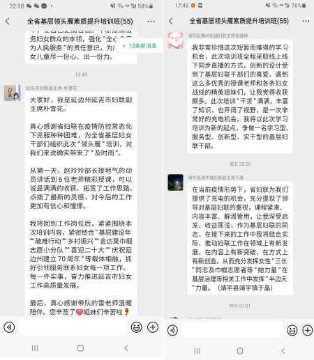 为深入贯彻落实习近平新时代中国特色社会主义思想和党的十九届历次全会精神,贯彻落实吉林省第十二次党代会精神和全省“基层建设年”部署要求,全面推进基层妇联组织改革“破难行动”和“基层妇联领头雁培训计划”,着力打造素质更加过硬的妇女工作队伍,2022年7月27日至29日,吉林省妇联在长春举办了全省基层妇联领头雁素质提升培训班。 省妇联党组高度重视此次培训,省妇联党组书记、主席李晓英就办好此次培训班提出明确指导意见,分管干部教育培训工作的党组成员、副主席刘丹亲自安排部署审定培训方案。 顺应当前疫情防控工作需要,此次培训班采取线上线下相结合的形式,线下在吉林省宾馆安排了来自县乡村的50名基层妇联干部、执委参训,与此同时,为了贯彻落实我省兴边富民工程,立足妇联职能积极参与易地扶贫搬迁安置工作,培训班扩大了授课对象,线上通过腾讯会议室吸纳了来自通化、白山、白城、延边4个地区的边境村以及易地扶贫搬迁安置点妇联干部,线上线下共110名学员参训。省妇联组织部副部长赵玲玲作开班动员讲话。 省妇联对此次培训班课程进行了精心设计,既突出当前政治形势,又考虑基层妇联工作需要,邀请省委党校、东北师范大学、省直部门等知名教授、学者、领导干部,围绕学习贯彻习近平总书记关于妇女工作的重要论述、学习贯彻吉林省第十二次党代会精神、全面落实新时代党的组织路线、党建引领基层社会治理、女性社会组织孵化与评估、加强基层常态化疫情防控工作6个专题进行授课辅导,内容丰富、课程紧凑,信息量大、知识面广,具有很强的针对性、理论性和实用性,为基层妇联干部、执委进行了一次高标准、高质量、高效率的“业务充电”。 省委党校马克思主义学院院长、教授王雪雁授课 省委党校党建教研部教授仲海涛授课 省委党校妇干校副校长、副教授冯皓授课 省委党校社会学教研部教授王慧姝授课 吉林省疾病预防控制中心副主任赵庆龙授课 东北师范大学社会学院副教授朱兴涛授课 培训期间,全省各地的“三八”红旗手、巾帼建功先进个人等妇女先进典型以及基层妇女群众通过线上云学习的方式,聆听了省委党校王雪雁教授对吉林省第十二次党代会精神的专题解读,深受妇女群众的认可和好评,最高在线人数达1200余人,点赞数达4.2万次。 培训结束后,学员们纷纷表示,此次培训及时解渴、受益匪浅,提高了政治站位,增强了履职能力,强化了身份认同,为今后更好地开展工作指明了方向,回去以后一定将所学知识及时归纳整理,认真消化吸收,宣传分享给身边更多妇女姐妹,学以致用,学用结合,转化为做好妇联工作的强大动力,为全面建设社会主义现代化新吉林贡献巾帼力量,以实际行动迎接党的二十大胜利召开。