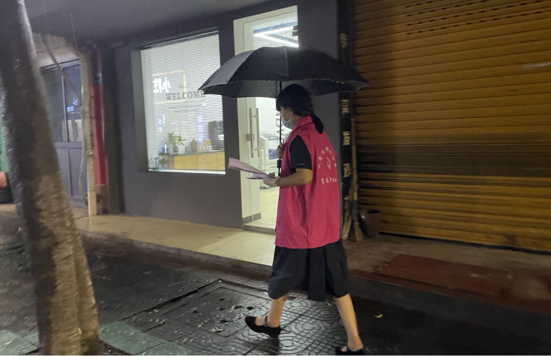 富春街道春华村妇联与村网格员并肩作战,开展“扫街行动”,戴家墩社区妇联干部和巾帼志愿者们冒雨连夜前往管控人员家中落实管控工作。