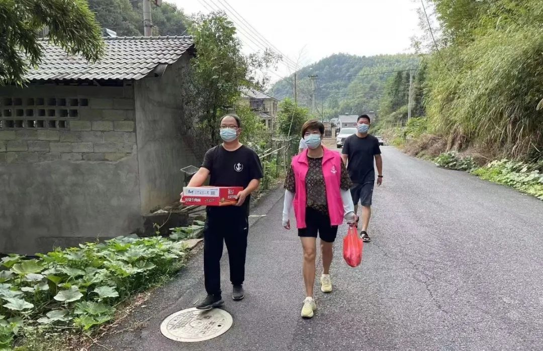 渔山乡妇联干部和巾帼志愿者们冒着大雨,为隔离管控人员运送物资。