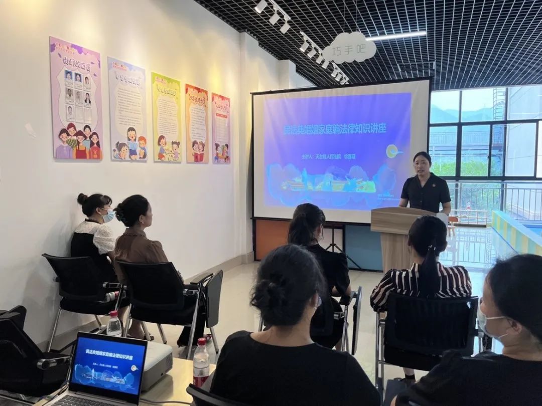巾帼和●共享法庭 为深入实施省妇联“巾帼和”行动,推动妇联工作力量与司法职能优势的有效整合,进一步维护妇女儿童合法权益,9月2日上午,“巾帼和·共享法庭”在天台县白鹤国际袜业城揭牌成立。天台县人民法院院长杨丹,天台县委政法委常务副书记、县公安局党委副书记、副局长张百罗,天台县人民法院副院长赵建都,天台县妇女联合会党组书记、主席吴琳玲,白鹤镇党委书记徐威等出席揭牌仪式。参加活动的还有白鹤镇妇联,白鹤国际袜业城业主代表和入驻商户代表等。 现场参观 揭牌仪式开始前,与会领导参观了天台首个市场服务型儿童之家、天台县白鹤国际袜业城巾帼“家门口创业圈”直播孵化基地等,详细了解了女性创业和妇女儿童服务等相关工作。 揭牌仪式 “巾帼和·共享法庭”的建立,旨在通过发挥“共享法庭”调解指导、普法宣传、基层治理等功能,精准对接妇女儿童的法律需求,让市场内的妇女儿童在“家门口”就能享受到优质高效、公平均等的司法服务,从而不断提升“和合好家庭”建设水平,助力共同富裕示范区标杆县建设。 普法讲座 天台县人民法院行政审判庭庭长、妇联主席徐喜霞作主题为《民法典婚姻家庭编》的法律知识讲座。徐庭长深入浅出地讲解了《民法典》中对妇女权益保护方面的规定,并针对妇女在婚姻家庭生活中经常会遇到的婚姻纠纷、财产分割、家庭暴力等问题进行解读,让妇女们学会更好地维护自身的合法权益,引导妇女将所学的法律知识运用到维护妇女权益工作的实践中,营造全社会维护妇女权益的良好氛围。 下阶段,天台县妇联将以“巾帼和·共享法庭”为平台,进一步加强与公检法司等相关部门的合作,实现信息互通、优势互补、矛盾联调,为维护妇女儿童合法权益、提升基层社会治理效能、助力平安天台和法治天台建设贡献巾帼力量,以实际行动迎接党的二十大胜利召开。