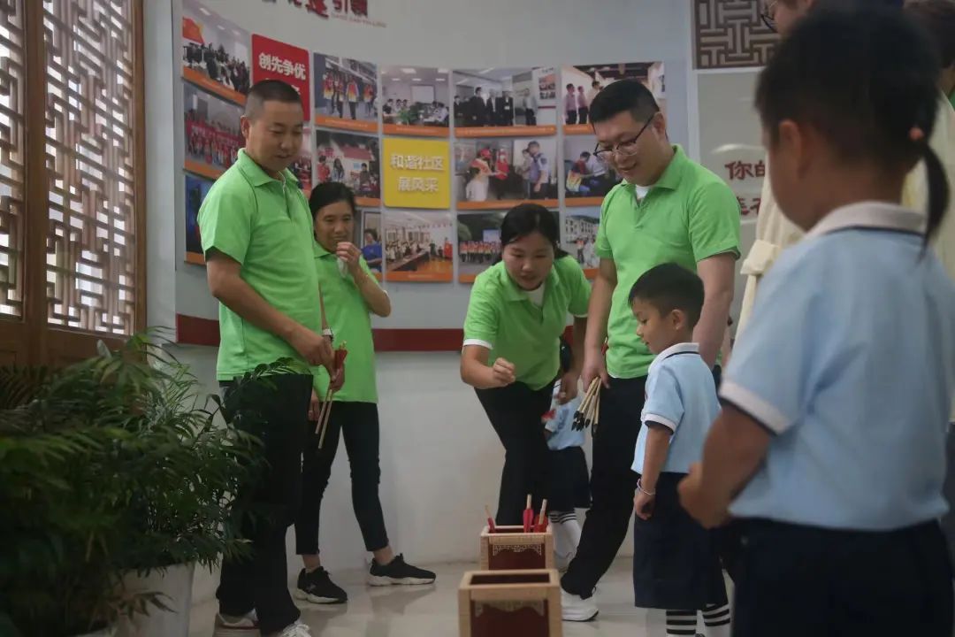 投壶起源于春秋战国,是中国古代士大夫宴饮时做的一种投掷游戏,也是一种礼仪。《醉翁亭记》中的“射”就是“投壶”这个游戏。古色古香的木壶,红彤彤的羽箭,运动员们迫不及待准备大展身手,拿到木箭后,小小的胜负欲被激起,“瞄准,投掷”争取一发即中。这边你追我赶,隔壁热火朝天,两人三足比赛中,刚刚被“束缚”的两位队友还在小声商量着如何统一步伐,一会儿工夫,从“举步维艰”变为健步如飞,孩子们在旁边拍手叫好。