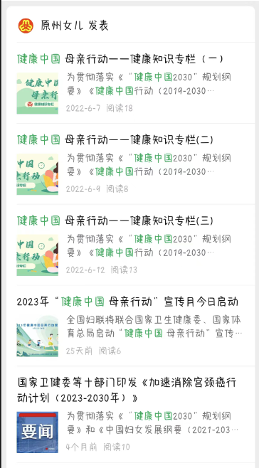 原州区妇联还在微信公众号“原州女儿”推出“健康中国 母亲行动”健康知识宣传专栏。持续推送“两癌”防治、妇幼保健、合理膳食、心理健康和运动健身等方面知识,引领广大妇女和家庭,落实“预防为主”方针,践行健康生活方式,推动妇女健康素养水平稳步提高,健康生活方式加快推广。