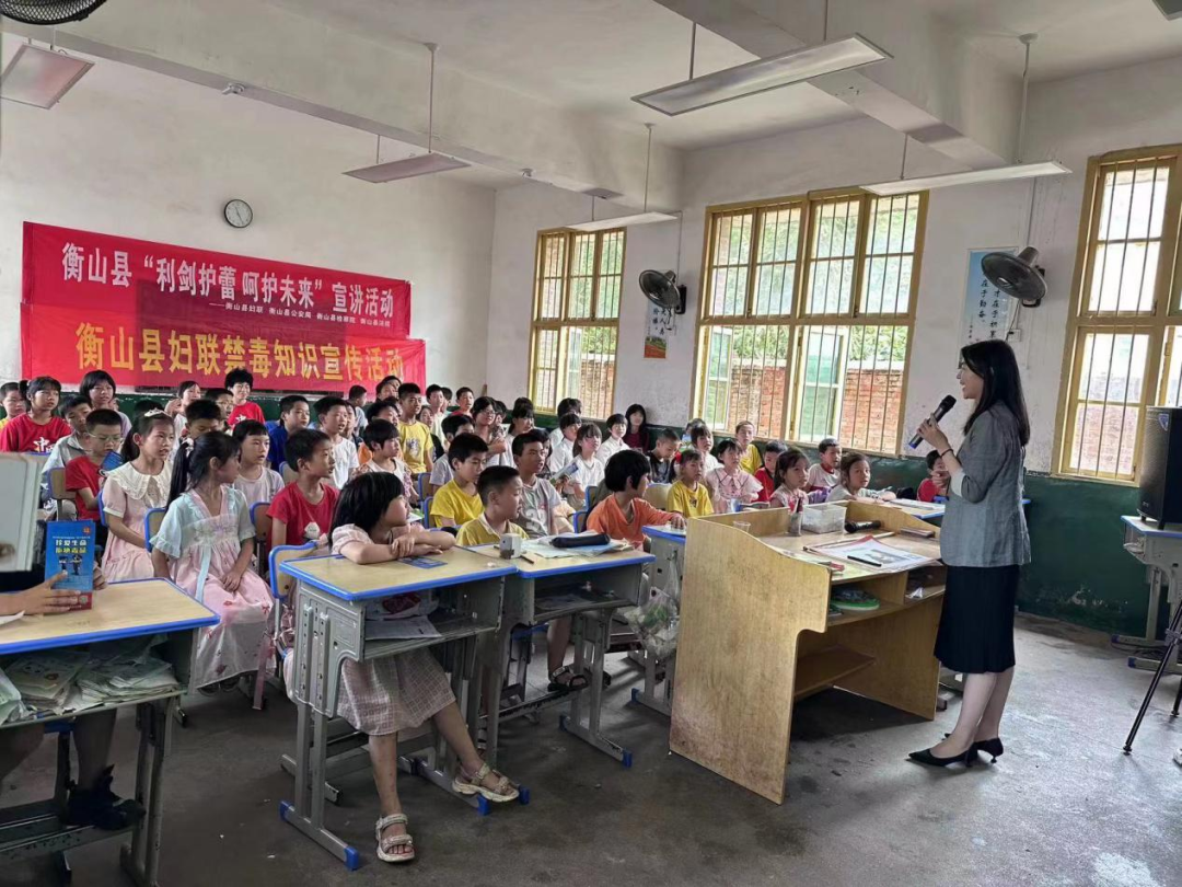 衡山县妇联在新桥镇、衡山县江东乡江东小学、贯塘乡枫林小学等地开展妇女儿童权益保护、防溺水、防性侵、禁毒知识宣传活动,发放禁毒知识手册。