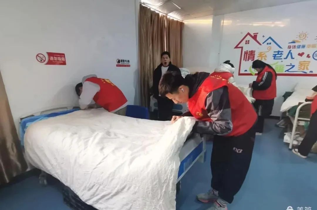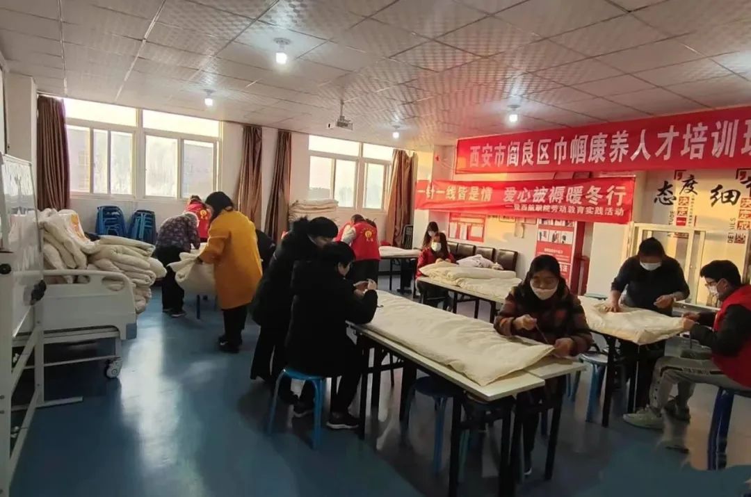 妇联执委、巾帼家政服务分队队长孙迎仙号召先洁巾帼志愿者、党员志愿者、老年人志愿者、大学生志愿者、社区志愿者齐聚航空一路社区先洁日间照料中心,穿针的穿针、缝制的缝制,为灾区赶制被褥。