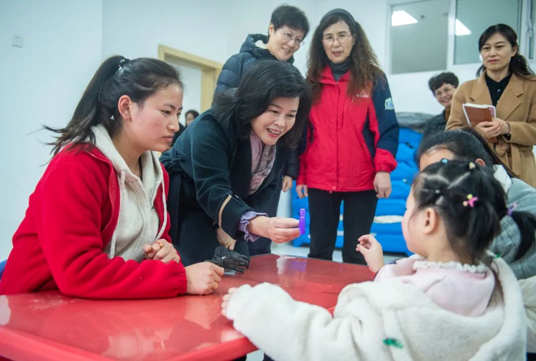 在南明区爱心家园儿童特殊教育康复训练中心,杨晓曼仔细了解爱心家园康复服务开展、家长培训、康复效能、队伍建设以及发展运营情况等,与“十联十帮”联系妇女爱心家园儿童特殊教育康复训练中心校长赵新玲进行交流,并看望慰问正在开展康复训练的困难儿童代表。