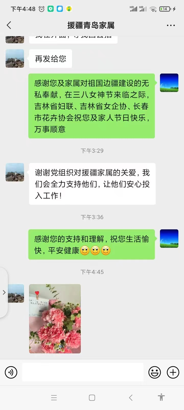 援疆干部刘迎春的爱人黄淑芬在青岛工作,省妇联了解情况后将鲜花邮寄到青岛,为她送上节日祝福,黄淑芬收到鲜花后,第一时间发送信息,激动的表示:“感谢妇联组织对援疆干部家属的关爱,收到这份礼物,心里特别温暖,我一定会照顾好家,全力支持丈夫,不负组织的重托。”