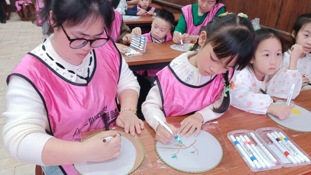 最后,家长和孩子们画团扇手工制作活动。通过亲手绘制团扇,让孩子们感受到传统文化的独特韵味,同时培养孩子们的创造力和动手能力。