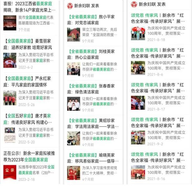 为贯彻落实习近平总书记关于注重家庭家教家风建设的重要论述,特别是在同全国妇联新一届领导班子成员集体谈话时的重要讲话精神,贯彻落实习近平总书记考察江西重要讲话精神,根据全国妇联2024年家风家教主题宣传月活动部署,江西省妇联从5月6日起,以“最美家力量”为主题,组织各设区市妇联开展家风故事宣讲接力展示活动,通过接力宣讲的方式,共同弘扬社会主义家庭文明新风尚,促进家庭和睦、家教良好、家风端正,为新时代新征程贡献家庭力量。 多年来,新余市妇联常态化开展寻找最美家庭、绿色(清洁)家庭创建活动,持续深化家庭文明创建,大力弘扬社会主义家庭文明新风尚,为奋进新征程注入精神动力、凝聚家庭力量。 高位推动深挖典型,彰显新时代最美家风 坚持以社会主义核心价值观为引领,新余市妇联与市委宣传部、市文明办联合推动寻找“最美家庭”、绿色(清洁)家庭创建工作常态化开展,以广泛参与为基础、以群众公认为标准,推选出一批批群众身边的优秀家庭典型,以最美家风弘扬时代新风,推动形成爱国爱家、相亲相爱、向上向善、共建共享的社会主义家庭文明新风尚。2017年以来,13户家庭获评全国五好家庭、最美家庭,76家庭获评全省最美家庭,378户家庭获评全市五好、最美家庭。 2024年“三八”国际劳动妇女节114周年大会上,参会领导为12户全省最美家庭授奖。 将绿色(清洁)家庭创建纳入全市乡风文明行动、农村人居环境整治工作考核,以考督行,确保绿色(清洁)家庭创建工作落到实处。100户农村清洁家庭示范户获市委市政府下文通报表扬,323户家庭获评全市绿色(清洁)家庭。 利用电视、报刊、网络等各类主流媒体宣传优秀家庭典型故事、展示创建工作成效,不断扩大“最美家庭”影响力,吸引更多的家庭参与到家庭文明创建中。 新余市妇联绿色(清洁)家庭创建工作案例入选全国妇联《为了家园更美丽-妇联组织“美丽家园”建设工作案例选编》 中国妇女报刊登《江西新余50户农村清洁家庭示范户获通报表扬》宣传报道 大型商超电子屏播放家风家教宣传片 线上举办最美家庭故事展示,线下开展好家风好家训征集,走近群众身边开展“最美家力量”家风故事宣讲,将“最美”故事传遍新余每一个角落,引导广大家庭积极传承和弘扬爱国爱家、相亲相爱、勤俭节约、睦邻友善、诚实守信、知礼明德等新时代良好家风。 线上最美家庭故事展示 全国、省、市五好、最美家庭代表在爱心妈妈结对、“书香飘万家 共抒家国情”家庭亲子阅读活动上宣讲“最美家力量”家风故事 全国最美家庭代表丁喜红在“渝钤巾帼心向党 感恩奋进新时代”先进事迹报告会上讲述最美家风故事 各级妇联广泛开展家风家教宣讲会 融入中心服务大局,凝聚新时代家庭力量 坚持将寻找最美家庭、绿色(清洁)家庭创建活动融入全市中心大局,做到三个“结合”,凝聚“最美家力量”。 与脱贫攻坚工作结合,2019年创新授予12户脱贫家庭“我脱贫我光荣”最美家庭称号,激励贫困家庭不等不靠、自强不息,用勤劳的双手创造幸福的生活。 在2019年“三八”国际劳动妇女节大会上,12户“我脱贫我光荣”最美家庭接受颁奖 与抗疫防疫工作相结合,2020年“清洁家庭筑屏障 人人防控有力量”的宣传图片文字和出现在新余的大街小巷,广大家庭积极响应,做好个人防护,培养良好卫生习惯,为抗疫防疫贡献家庭力量,13户家庭获评全国、全省抗疫最美家庭,15户家庭获评全市抗疫防疫类最美家庭。 与城市创建工作相结合,开展“城市创建 家庭在行动”绿色(清洁)家庭事迹展示,以示范引领带动广大家庭身体力行参与城市创建行动,倡导在装点温馨舒适“小家”的同时不忘美化净化新余这个“大家”,营造“人人参与家家行动,共创共享美好生活”的良好社会氛围。 绿色“清洁”家庭成员作为志愿者积极参与城市创建行动 下一步,新余市妇联将持续开展寻找最美家庭、绿色(清洁)家庭创建活动,进一步深化家庭文明创建,以千千万万家庭的好家风支撑起全社会的好风气,为加快打造新型工业强市,奋力谱写中国式现代化新余篇章贡献“最美家力量”。