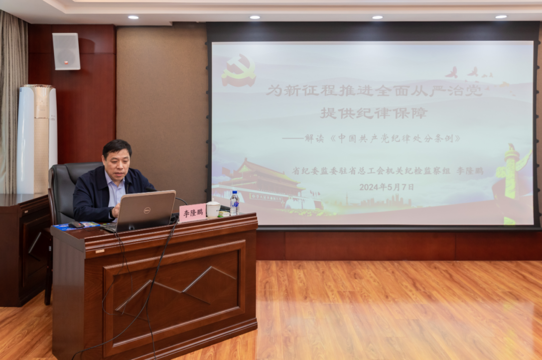 省纪委监委驻省总工会机关纪检监察组组长李隆鹏围绕《条例》为全体党员干部作了专题辅导。他从《条例》修订的背景、《条例》新修订内容和《条例》贯彻落实等方面,结合真实案例,对《条例》进行深入细致的解析,使全体党员干部进一步理解把握《条例》的精神要义和规定要求,强化纪律观念,增强党性修养,筑牢拒腐防变思想防线。