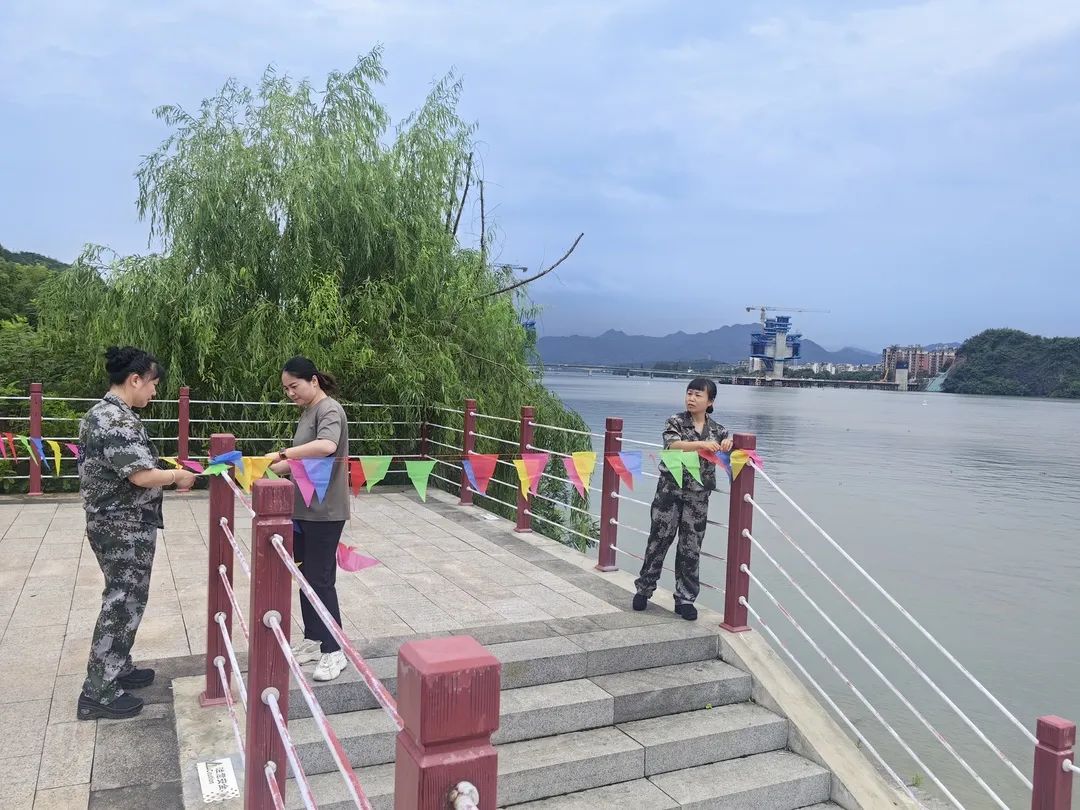 ▲三都镇巾帼志愿者在江边拉起警戒线