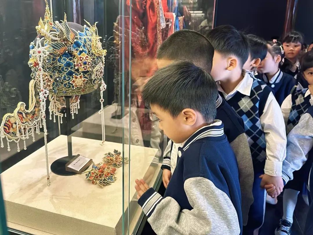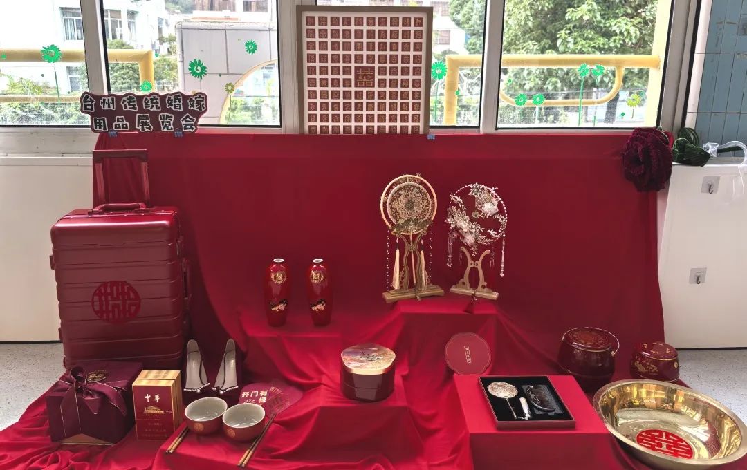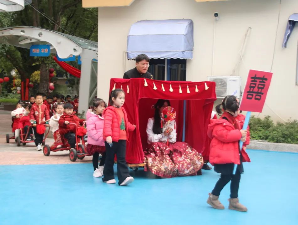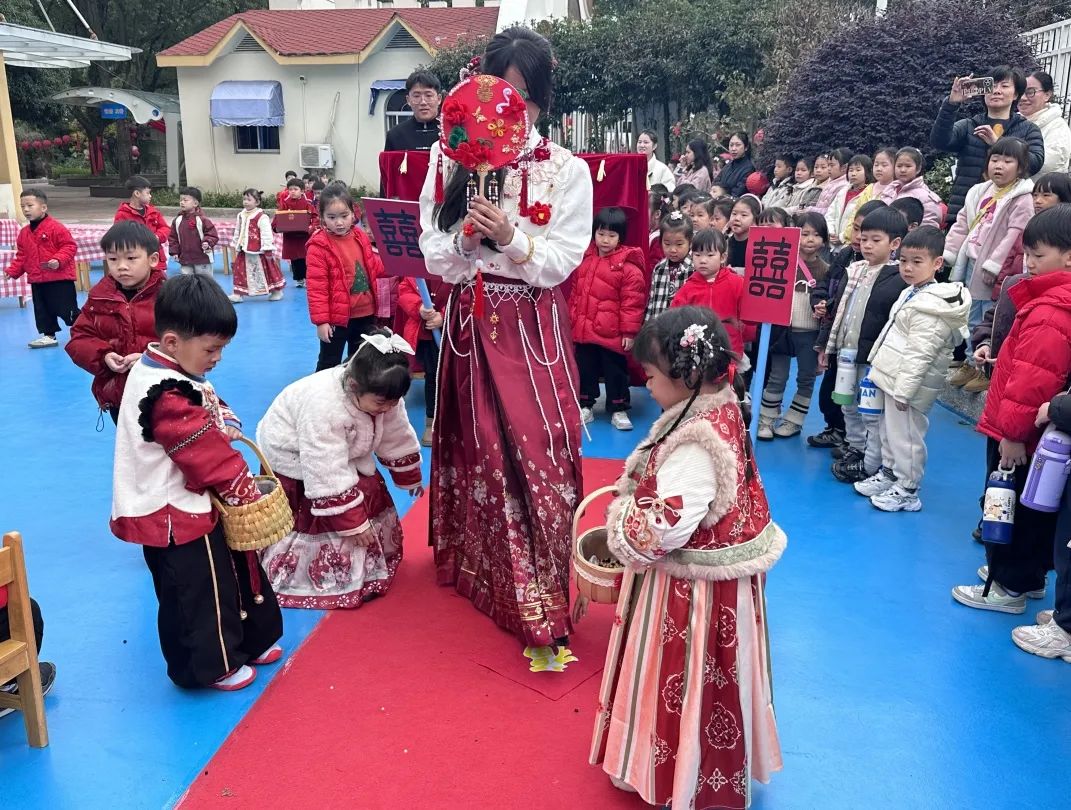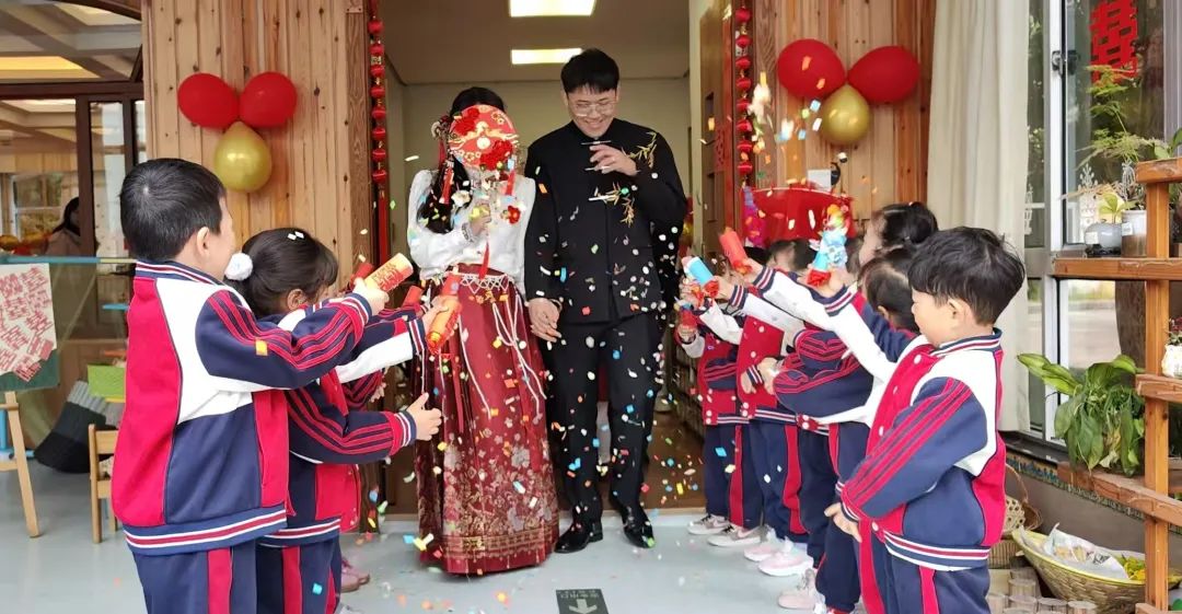 婚礼前的准备 什么是中式婚礼?中式有哪些传统仪式?具台州特色的传统婚礼需要准备什么呢?带着这些问题,孩子们走进葭沚老街婚俗馆,开展了一场特别的儿童观察活动,切实感受传统婚嫁风俗。 孩子们观看台州和合婚俗科普视频,阅读《老鼠娶新娘》等绘本故事,了解到传统婚俗背后的意义;还在家里搜罗爸爸妈妈、爷爷奶奶结婚时的传统物件,听长辈说说传统婚俗用品的寓意。 婚礼进行时 在了解传统婚俗二三事后,孩子们知道办一场中式婚礼可真不简单!于是一份中式婚礼工作招募令在各个班级里传开,每个人都可以选择自己想要参与的工作,开启团队协作模式。孩子们在婚礼筹备中了解各种传统婚俗元素和仪式,大到婚礼布景,小到喜轿、喜帖、传统嫁妆、踩福袋、撒谷豆、跨火盆、却扇诗、拜堂仪式......每一个细节都透露出孩子们对传统文化的热爱与传承。 这场在童言童语中诞生的中式婚礼,不仅仅是一场婚礼,更是一次对中华优秀文化的传承与创新。从最真实的儿童视角出发,让“儿童友好”成为了这场中式婚礼的温暖底色。