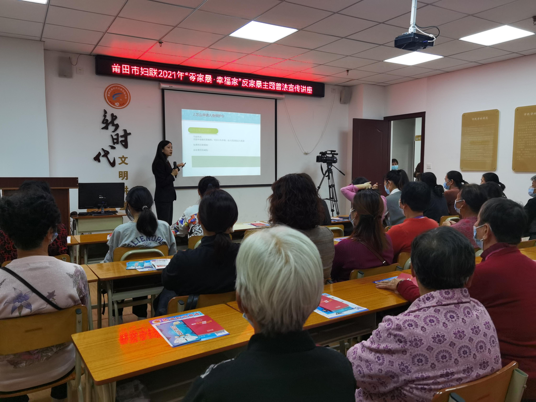 11月20日,莆田市妇联在荔城区南郊新时代文明实践站举行“零家暴 幸福家”为主题的反家暴宣传活动,现场通过讲座、设点咨询、趣味游戏的形式,普及反家暴知识,引导居民做文明、幸福家庭的践行者和守护者。