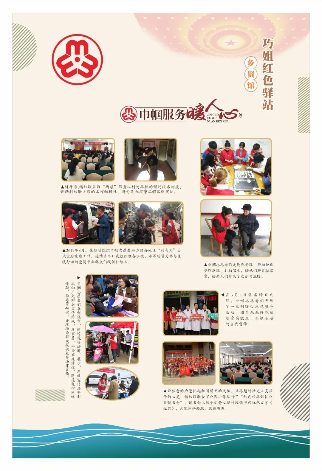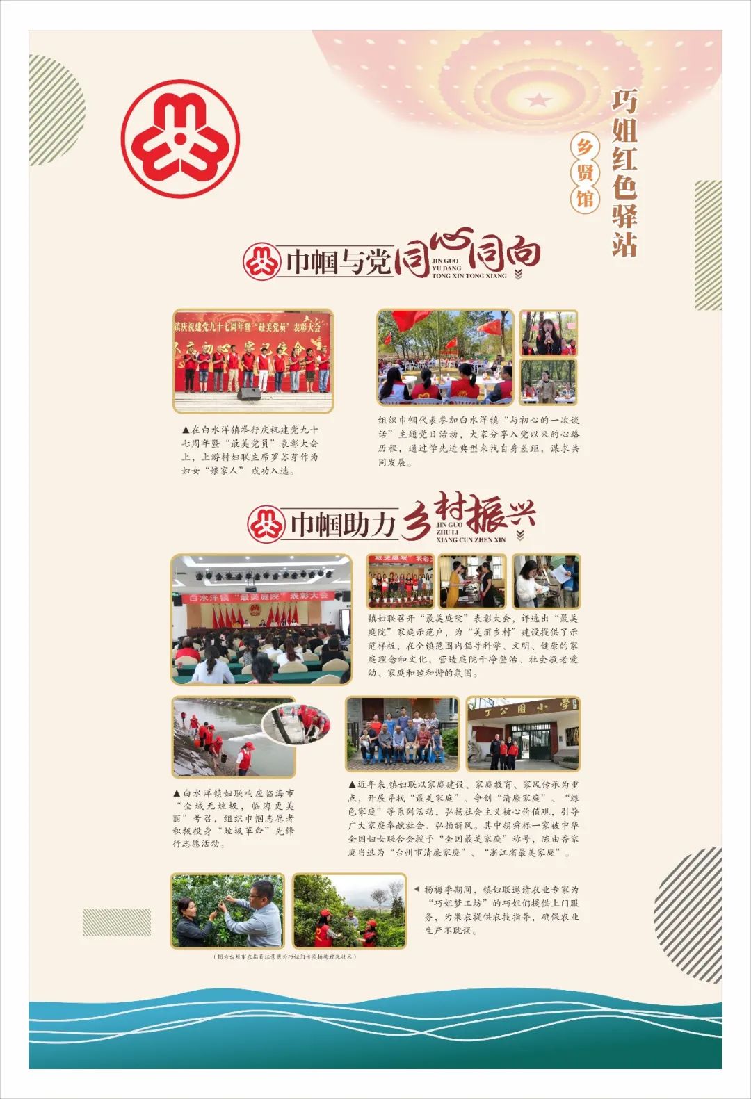 2021年是建党百年,又一个“历史时刻”,又一个“关键时间”。为形成妇联品牌示范带动效应,夯实基层妇联组织阵地建设,围绕共同富裕示范区建设探索基层妇联工作新路径,临海市妇联以培育“一镇(街)一项目一品牌”为抓手,按照“增实效、创亮点、促服务”原则,打造一批特色鲜明、群众满意的妇联品牌,不断深化基层妇联组织改革破难。 浙江省临海市妇联公众号推出《“一镇一品”项目巡展》专栏,逐期为大家介绍各镇(街道)妇联品牌! 今天,临小美带大家走进的是《白水洋镇溪畔新庄美好生活实践基地》 白水洋镇妇联在溪畔新庄农耕文化园成立“巧姐梦工坊”,通过组建队伍、整合资源、丰富活动等系列举措,将其打造成白水洋妇女创业创新、美好共享、助力共富的重要实践基地。 黄沙麦编“巧姐梦工坊” 白水洋镇妇联结合辖区手工制造业,以传承非物质文化遗产为契机,组织妇女学习编织黄沙麦编、黄沙织带等,成立“黄沙麦编工作室”,目前已发展到20多名工作人员。致力于全方位引导巾帼创业,助力乡村振兴,打造美好生活。 按照“党建带群团、群团助发展”的思路,整合妇联、共青团、工会等群团组织资源优势,打造群团组织联动共同体,亮出服务妇女、青少年、职工等群体的职能职责和品牌。通过共组联盟队伍、共建联盟之家、共享联盟阵地、共办联盟活动等形式,进一步解决群众所需所盼,实现了党群同心同行。 白水洋巧姐红色驿站以“党建+妇建”红色引领,分巾帼与党同心同向、巾帼助力乡村振兴、巾帼服务暖人心三大部分详细展示了包括巧姐们在内的白水洋巾帼风采。 丰富活动 美好生活 汇集巧姐力量,组织丰富多彩的活动,彰显令人欣喜的乡村“她力量”。今年以来,开展以“大手拉小手,五水共治齐心走”“传承民俗 浓情端午”“守护童年 牵手共成长”麦编学习等系列主题活动,用巧手织就乡村生活幸福图景。 ▲巧姐护水小分队在黄沙溪溪畔清理垃圾 ▲巧姐们将亲手制作的粽子和香囊送到孤寡老人、低保户家庭 ▲巧姐们教授儿童麦编,传承传统文化群团联建溪畔之家