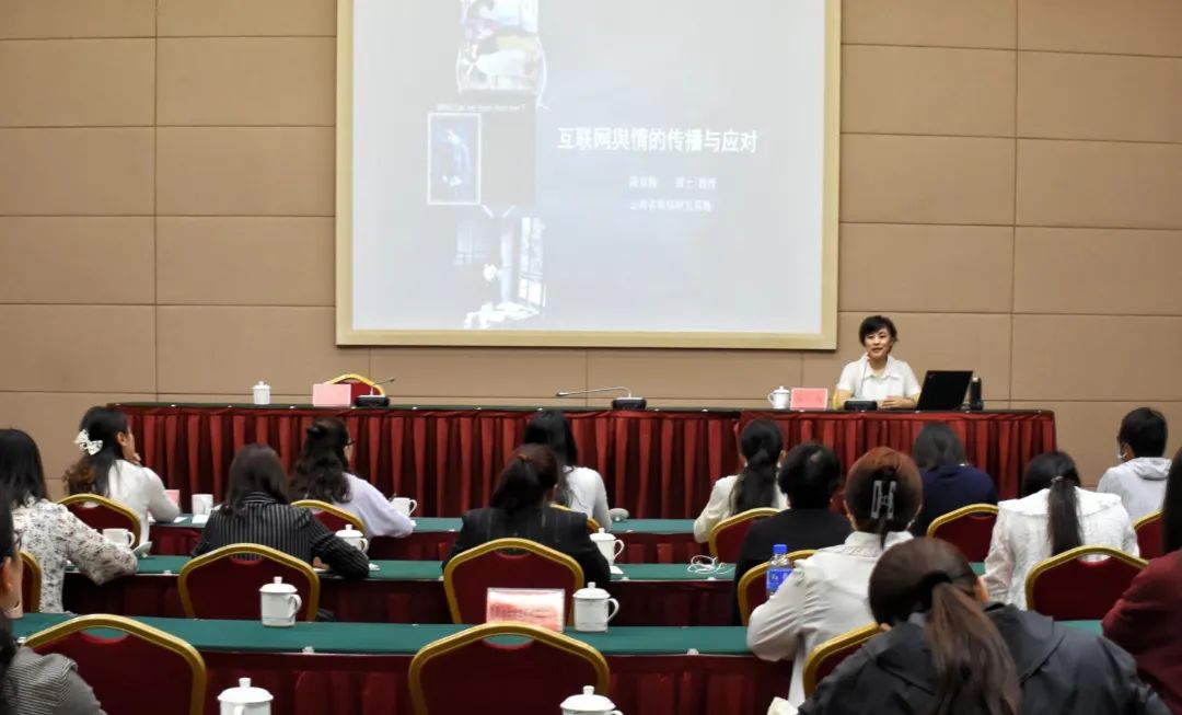 会议邀请了云南省舆情研究基地办公室主任陆双梅、昆明市正能量网络文化传播实训基地讲师曹月分别作专题培训。陆双梅从具体案例切入,分析讲解舆情传播特点、舆情研判与处置方式。曹月通过分享新闻报道范例,讲述新闻写作技巧及要领。