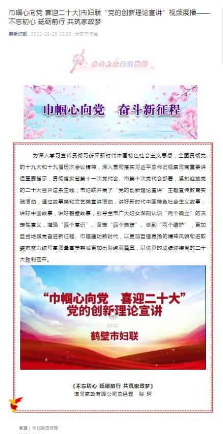 鹤壁市妇联紧紧围绕迎接宣传贯彻党的二十大工作主线,以“巾帼心向党”“巾帼暖人心”“巾帼建新功”“巾帼促和谐”等活动为重点,丰富活动载体,彰显妇联特色,因地制宜开展群众性宣传教育活动,团结带领广大妇女为实现“两个确保”,续写富美鹤城高质量发展的绚丽篇章贡献巾帼力量。以“强国复兴有我”为主题,深入开展“巾帼心向党 喜迎二十大”群众性主题宣传教育活动。组建“党的创新理论”巾帼宣讲小纵队,发挥好基层巾帼宣传队作用,坚持线上与线下呼应、日常与节点结合,组织开展党的创新理论宣讲、主题文艺演出、经典相伴专场朗诵会、基层巾帼宣传队优秀节目展播等活动,宣传党和人民创造的新业绩,讲述妇女事业发展的新成就,展现富美鹤城奋进新征程的生动局面,引导全市妇女群众更加自觉地跟党奋进新征程,努力在推动高质量发展中建功立业。技能河南,巾帼在行动。围绕中心服务大局,推进妇女创业就业,健全以“巧媳妇”基地为主体,社会力量广泛参与的工作机制,线上线下同步推进“人人持证、技能河南”建设,举办养老护理、母婴护理、家政、烹饪、服装加工、农业种植类等技能培训班40余期。