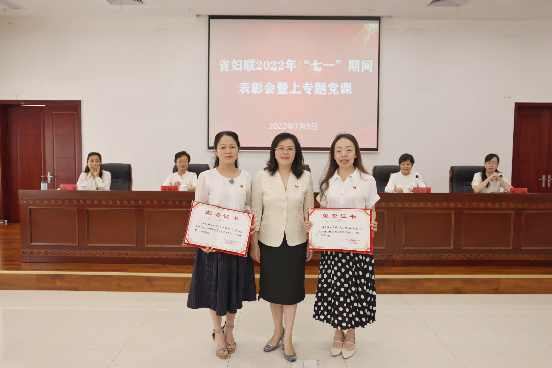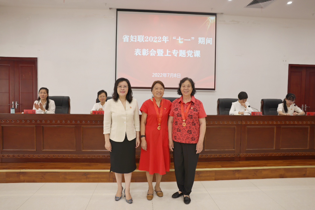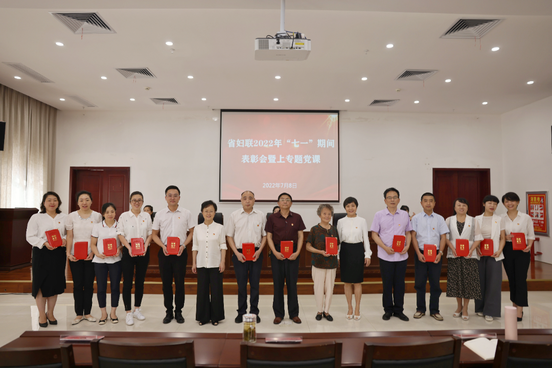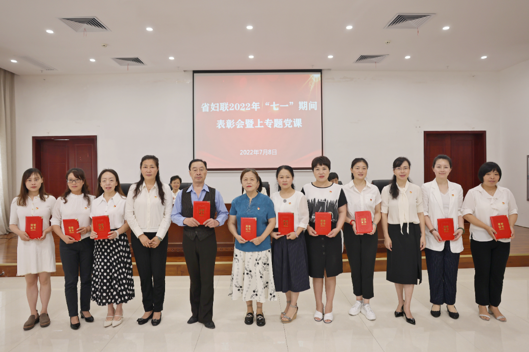 7月8日,贵州省妇联召开2022年“七一”表彰会议,会议为“光荣在党50年”的老党员颁发纪念章,表彰了先进党组织、优秀党员和优秀党务工作者,省妇联主席、党组书记杨晓曼为全体党员上专题党课。 为认真贯彻落实省第十三次党代会精神,喜迎党的二十大胜利召开,进一步激发省妇联党员干部“知党、爱党、信党、颂党、跟党走”的爱国情感,不断提高党组织的创造力、凝聚力、战斗力,进一步发挥党员先锋模范作用。“七一”期间,省妇联先后开展离退休干部党建工作专题座谈会、教育现场教学、走访慰问驻村点困难老党员等活动。 表彰会上,与会领导宣读了《关于表彰2021-2022年度省妇联优秀共产党员、优秀党务工作者和先进基层党组织的决定》,为李静先、王昭琼、邹圣翠3名离退休党员颁发了纪念章,并为受表彰的党组织和个人颁发了荣誉证书。会议要求受表彰的同志和党支部珍惜荣誉、当好表率、再接再厉,为妇女和妇联工作高质量发展再立新功。 杨晓曼以“大力弘扬伟大建党精神和女性“四自”精神争做信念坚、政治强、本领高、作风硬的党员干部”为题讲授专题党课,她指出,全体党员要继续深入学习贯彻习近平总书记系列重要讲话精神,衷心拥护“两个确立”,不断增强“四个意识”、坚定“四个自信”、做到“两个维护”,不断增强政治判断力、政治领悟力、政治执行力;要进一步深入学习贯彻省第十三次党代会精神,聚焦主战略主定位,牢记嘱托、奋力拼搏,团结引领广大妇女听党话、感党恩,全面推动贵州妇女儿童事业和妇联工作高质量发展,为多彩贵州现代化建设作出积极贡献,用优异成绩喜迎党的二十大胜利召开! 省妇联机关及妇儿活动中心全体党员干部和部分离退休党员代表参加会议