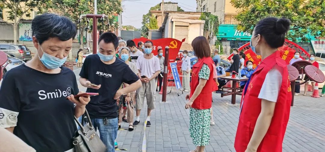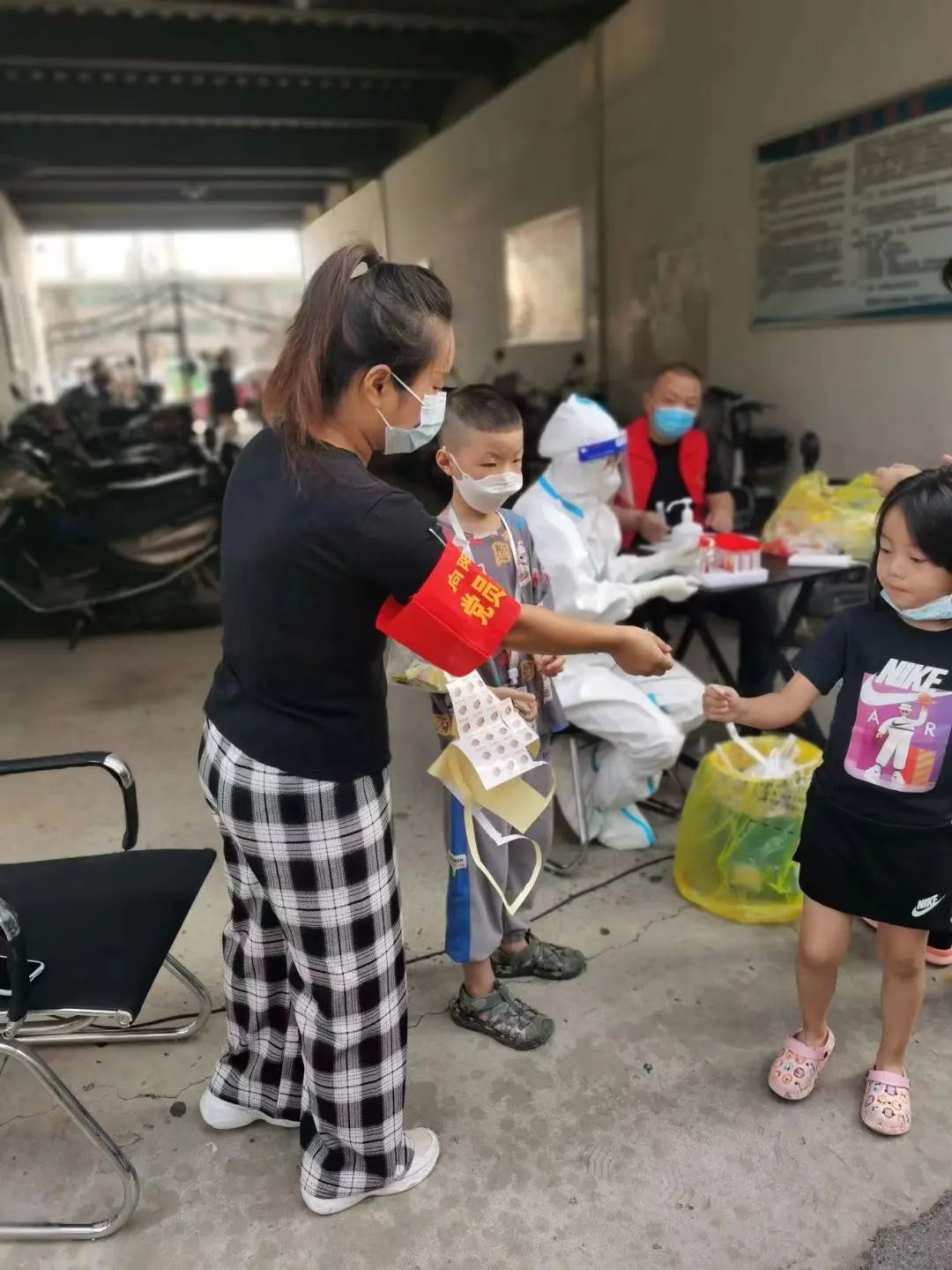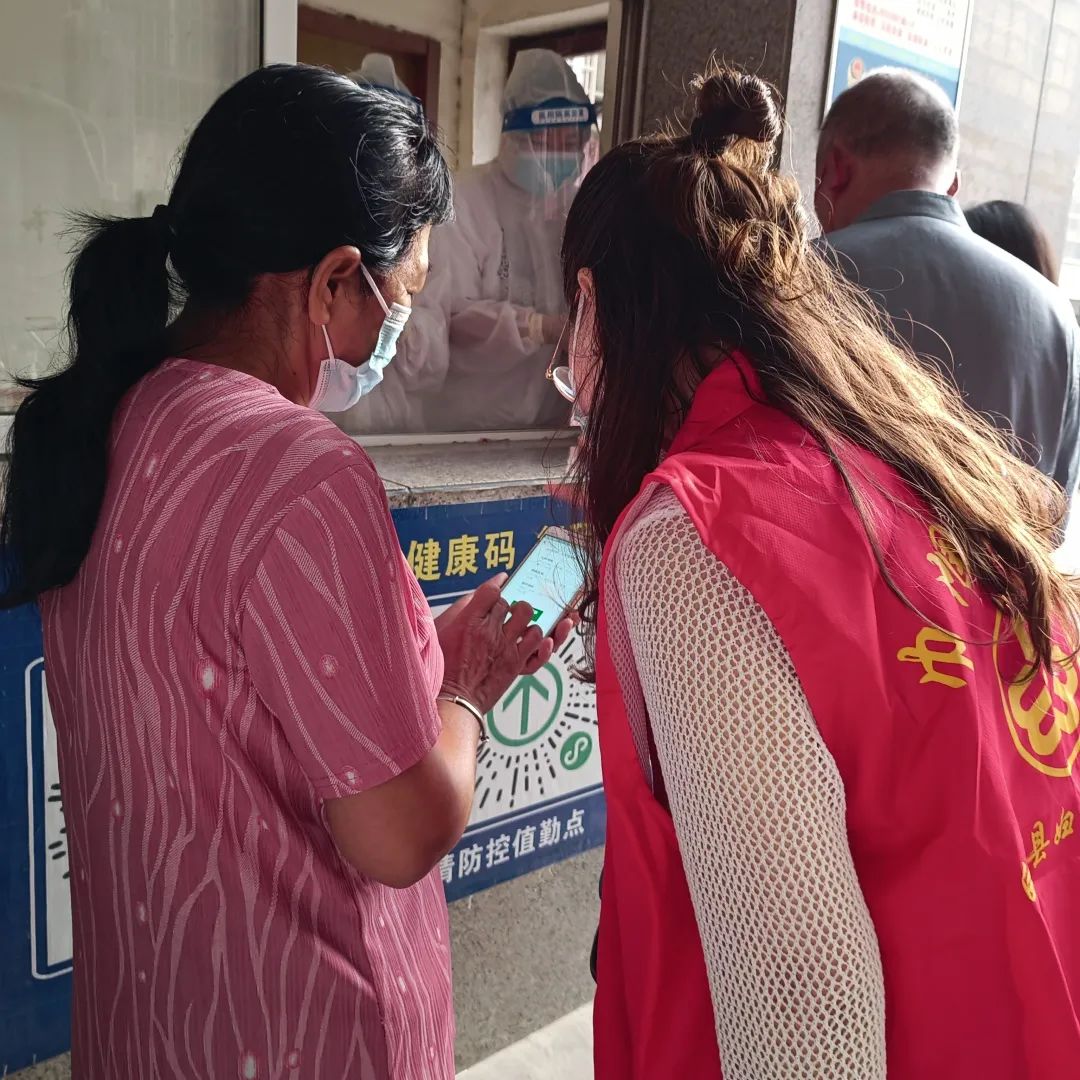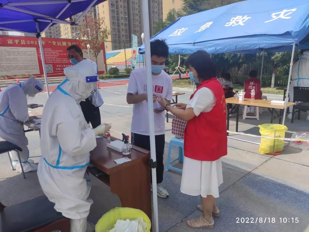 富平县妇联全体党员干部自8月17日首轮核酸检测开始,每日凌晨4:30起下沉到各自包联社区,配合核酸检测人员扫码、测温,发放“富庶太平”“柿柿如意”“富昌通达”贴纸, 指导居民排队、注册并登记个人信息等,为核酸检测的有序顺利进行贡献巾帼力量。