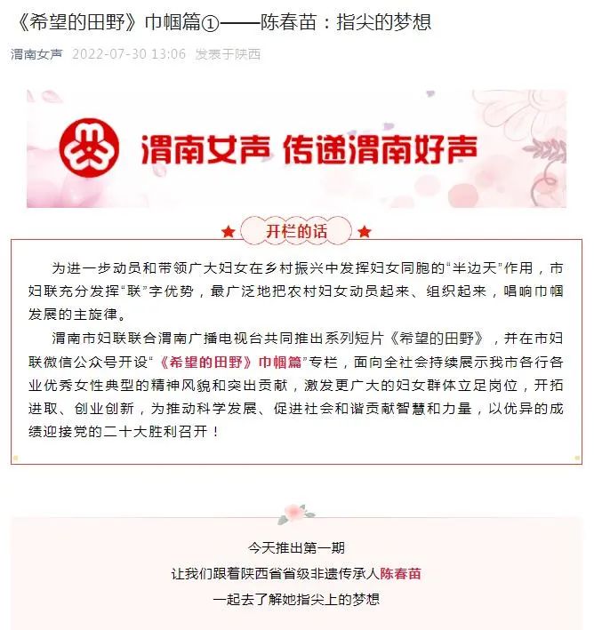 联合渭南广播电视台共同推出系列短片《希望的田野》,并在微信公众平台开设“《希望的田野》巾帼篇”专栏,面向全社会持续展示我市各行各业优秀女性典型的精神风貌和突出贡献,激发更广大的妇女群体立足岗位,开拓进取、创业创新。