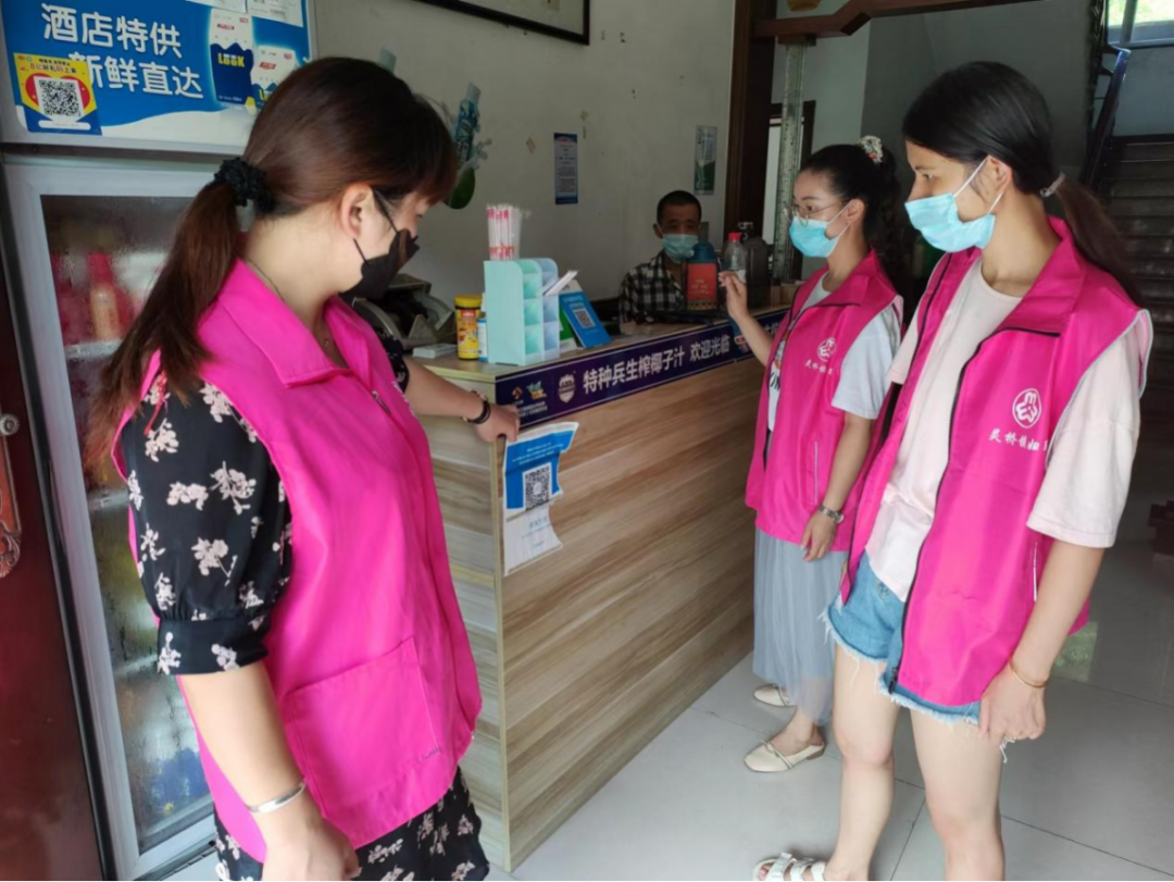 灵桥镇的巾帼志愿者们走街串巷,开展疫情防控宣传教育工作和地毯式排查活动,检查经营场所消杀与场所码使用情况等。