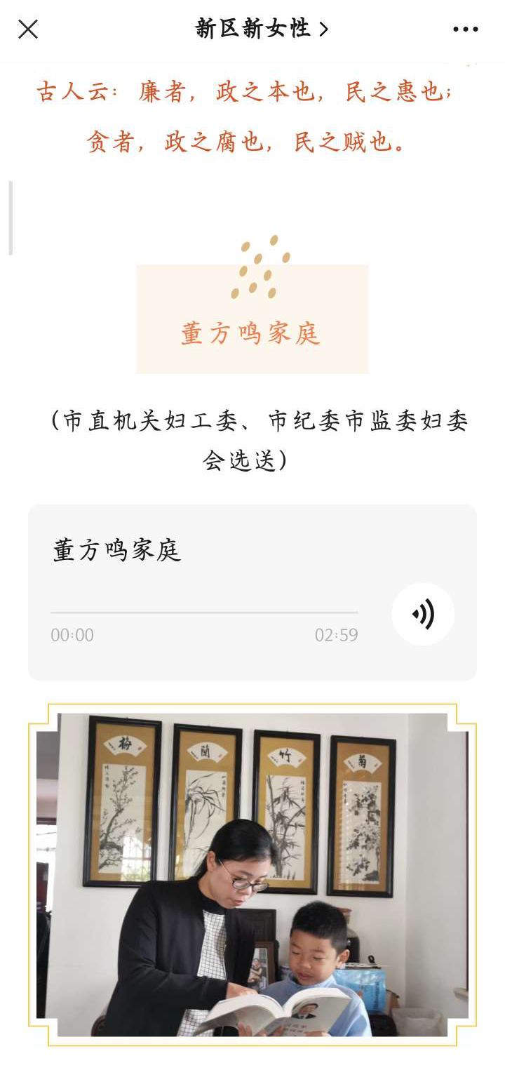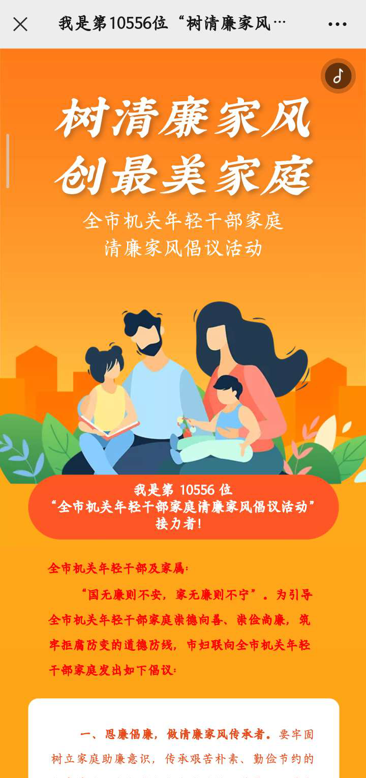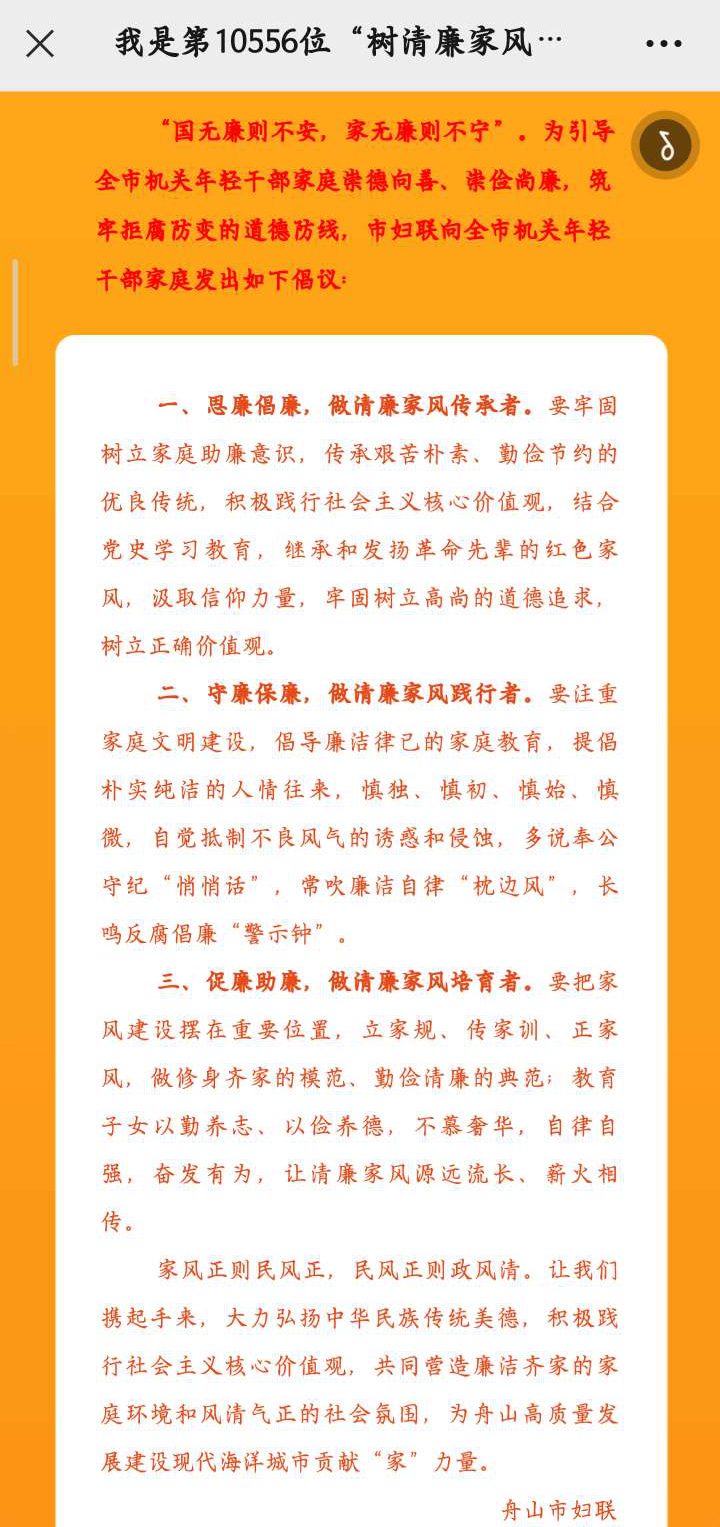 勤以为民,廉以养德,淡以明志,静以修身。 为深入贯彻落实习近平总书记关于注重家庭家教家风建设重要论述以及在十九届中央纪委六次全会上的重要讲话精神,贯彻落实省第十五次党代会关于打造新时代党建高地和清廉建设高地的目标要求,浙江省舟山市妇联系统围绕“清风传家·德润之江”活动主题,重点在全市机关干部家庭中组织开展“树清廉家风 创最美家庭”系列活动73场,参与2万余人次,努力营造“以孝敬亲情和睦家庭,以明礼贤德教化子女,以良好家风沁润社会”的良好氛围。 01开展“清风倡廉”家庭倡议活动 以图文接力的形式向全市机关年轻干部家庭发放“树清廉家风 创最美家庭”活动倡议书,已转发10554人次,倡导年轻干部自觉树立良好家风,建设积极乐观向上的廉政家庭文化,让家庭成为充满和睦亲情与温馨的空间、远离腐败的洁净港湾。 02开展“最美家庭”寻找选树活动 以寻访季度“最美家庭”为抓手,选树一批清廉家风典型,集中宣传一批对党忠诚、无私奉献、崇德治家、廉洁齐家的清廉家风故事。通过正面典型示范引领,提高机关干部家庭的廉洁自警意识,树立正确的价值观念和高尚的道德情操。 新城管委会开展“清廉家风进万家”活动 市直机关妇工委开展机关“最美家庭”活动 03开展“家风助廉”故事分享活动 以弘扬清廉家风为主题,联合市纪委、市委组织部等部门举办全省首个市属单位“一把手”及家属专题培训班,开展家庭家教家风建设教育活动。全市各级妇联通过榜样示范引领、文化熏陶感染等形式组织开展家风故事分享会等,引导广大党员干部把廉洁要求贯穿到家庭教育和日常生活中,做廉洁文化的传承者、守护者、倡导者。 市妇联联合相关部门开展全省首次“一把手”及家属家庭家教家风建设教育活动 普陀区沈家门街道大干社区妇儿驿站妇联开展清廉家风故事分享会 普陀区桃花镇沙岙村妇联开展“清风传家·德润之江”主题活动 04开展“读书思廉”作品征集活动 通过征集一批兼具思想性、艺术性和观赏性的书法绘画、音频视频等原创作品和宣传品,引导家庭成员积极建设温馨、廉洁、幸福的家庭港湾,守好廉洁的“后门”。 05开展“学悟思廉”家风建设活动 以新时代共产党人的良好家风为主题层层开展主题党日活动,组织党员干部学习革命前辈家风事迹,增强培育优良家风的主动性和自觉性。赓续红色血脉,学习红色精神,让广大党员干部感受优良家风魅力,筑牢反腐倡廉家庭防线。 普陀区白沙岛管委会妇联开展“涵养好家风”主题党日活动 普陀区沈家门街道妇联组织参观茅洋会议纪念馆 岱山县高亭镇妇联组织参观红色传承馆 言廉为虚,行廉为实,身廉为标,心廉为本。让我们一起行动,共建清廉舟山!