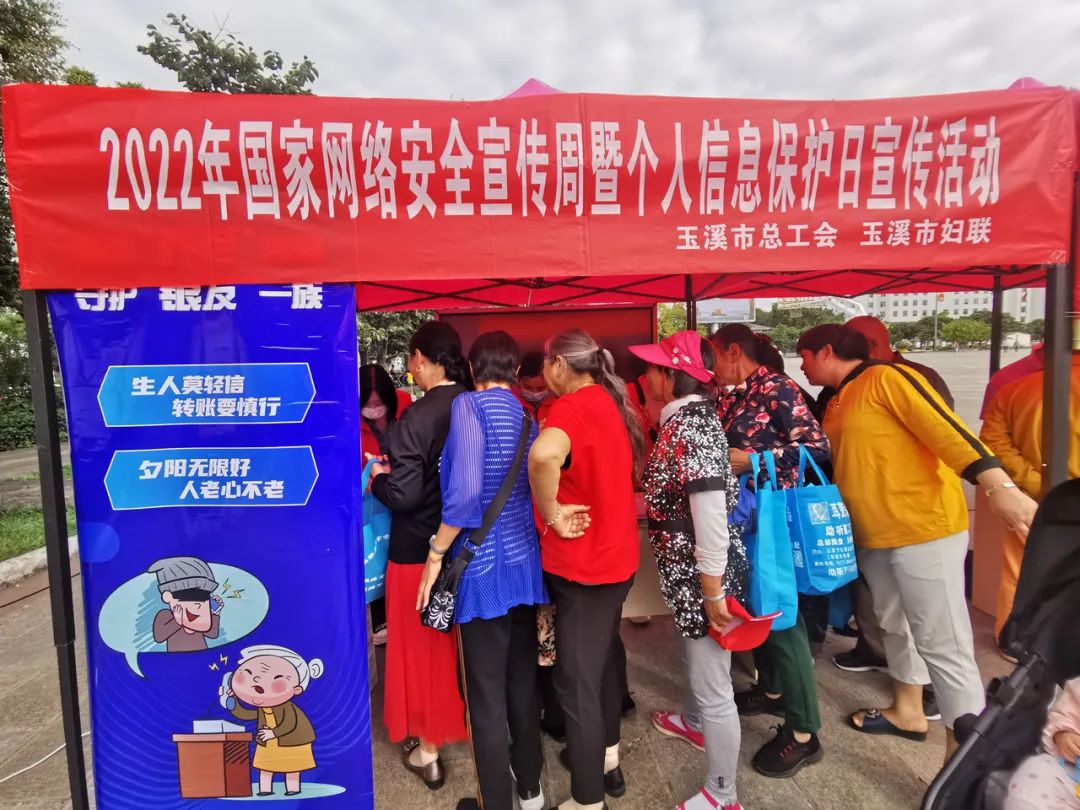 为增强广大网民的网络安全意识,提升基本防护技能,营造安全健康文明的网络环境。在2022年国家网络安全宣传周9月5日-11日期间,云南省玉溪市妇联围绕“网络安全为人民,网络安全靠人民”主题,丰富宣传形式和载体,线上线下相结合开展了一系列网络安全宣传活动。 玉溪市妇联联合市总工会下发《关于在全市工会、妇联系统开展2022年国家网络安全宣传周主题活动的通知》,以线上线下相结合,组织实施“五个一活动”。一是发布一个个人信息保护倡议书,在微信公众号上开设“网络安全宣传”发布网络安全宣传倡议书2个,宣传信息10条;二是开展一场个人信息保护日主题活动。9月11日同步全国、省妇联开展个人信息保护主题日活动,活动现场,通过悬挂标语、摆放版面、播放网络安全视频、发放宣传彩页、现场讲解等方式,向过往群众讲解网络安全常识,呼吁广大群众保护个人信息安全,提高反诈骗能力。向市民发出《保护个人信息安全 共筑网络安全防线》等网络安全宣传资料1000余份。三是组织一次网络安全谜语现场竞赛,设置50个网络知识小谜语,在个人信息保护主题日活动现场,开展了现场有奖竞猜,吸引了广大市民积极参与,扩大了宣传影响力。四是举办一场职工网络安全竞赛,面对全市广大市民,推出线上网络知识有奖竞赛,激发广大市民参与热情,营造良好的宣传氛围。五是制作H5开展一场巾帼好网民接力活动,上千名网民宣誓、接力要从自己做起,共同抵制网络不法行为,携手共建绿色网络空间。 通过2022年网络安全宣传周活动的开展,充分调动了广大市民的参与热潮,增强了广大市民的网络安全意识,提升群众网络安全意识和防护技能,全面营造全社会共筑网络安全防线的浓厚氛围。