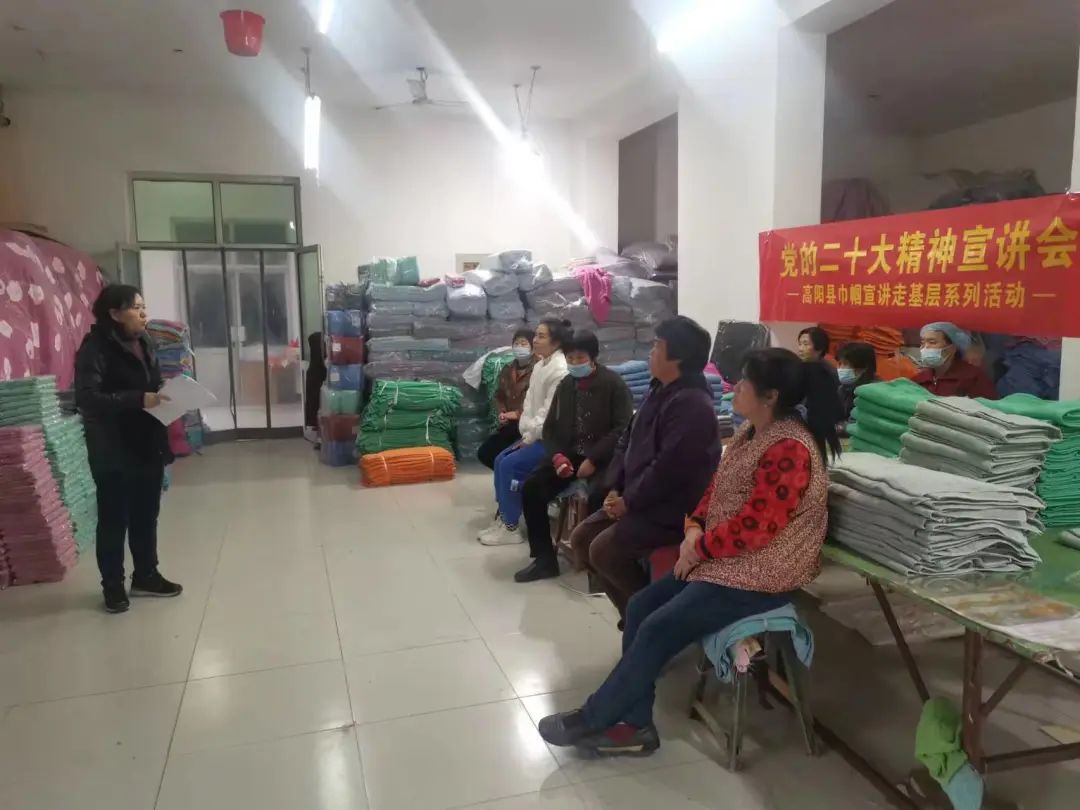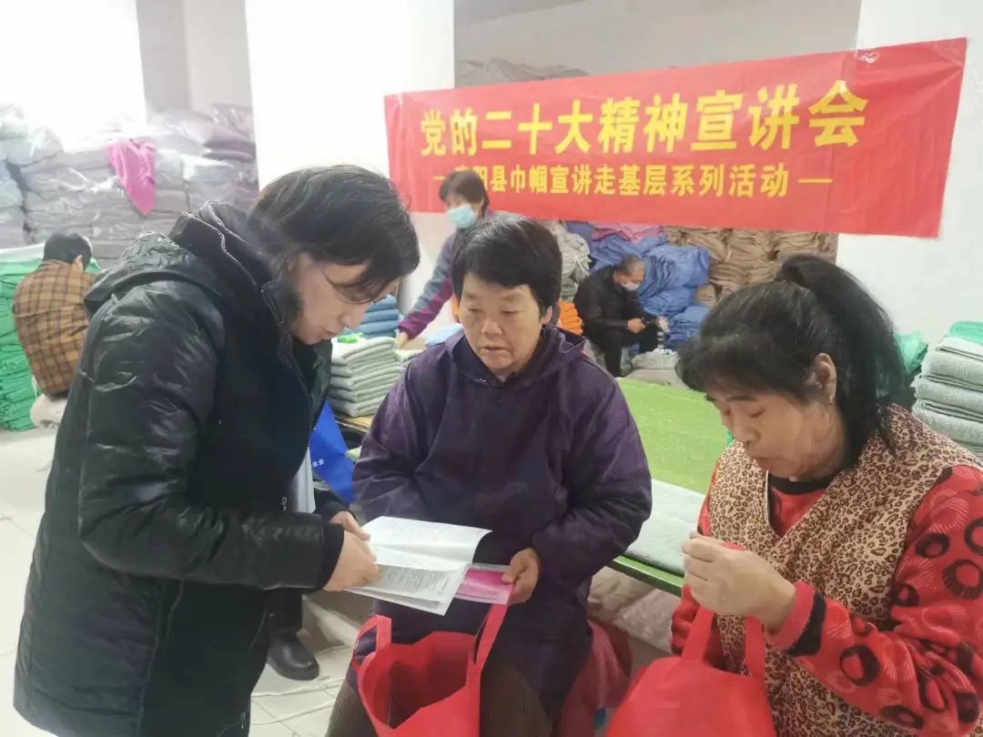 县妇联班子成员赵亚娟深入高阳双益纺织品公司车间,向妇女姐妹宣讲二十大精神,宣传惠民惠企政策。