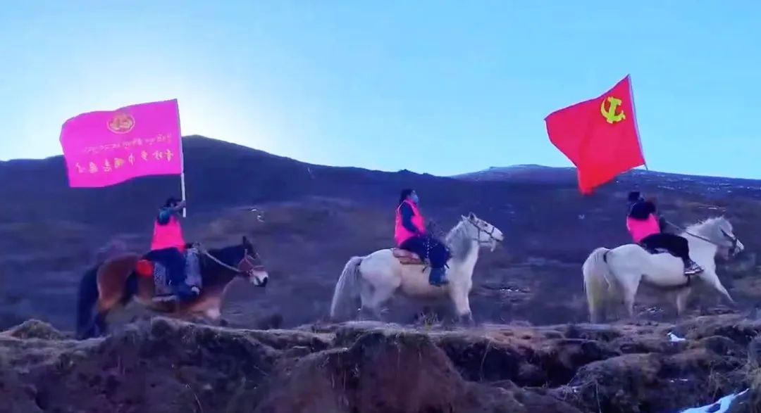 果洛藏族自治州甘德县青珍乡巾帼马背宣讲队骑马翻山越岭,深入偏远牧户家中宣讲党的二十大精神,把党的声音传递到偏远牧区,努力打通服务群众的“最后一公里”。