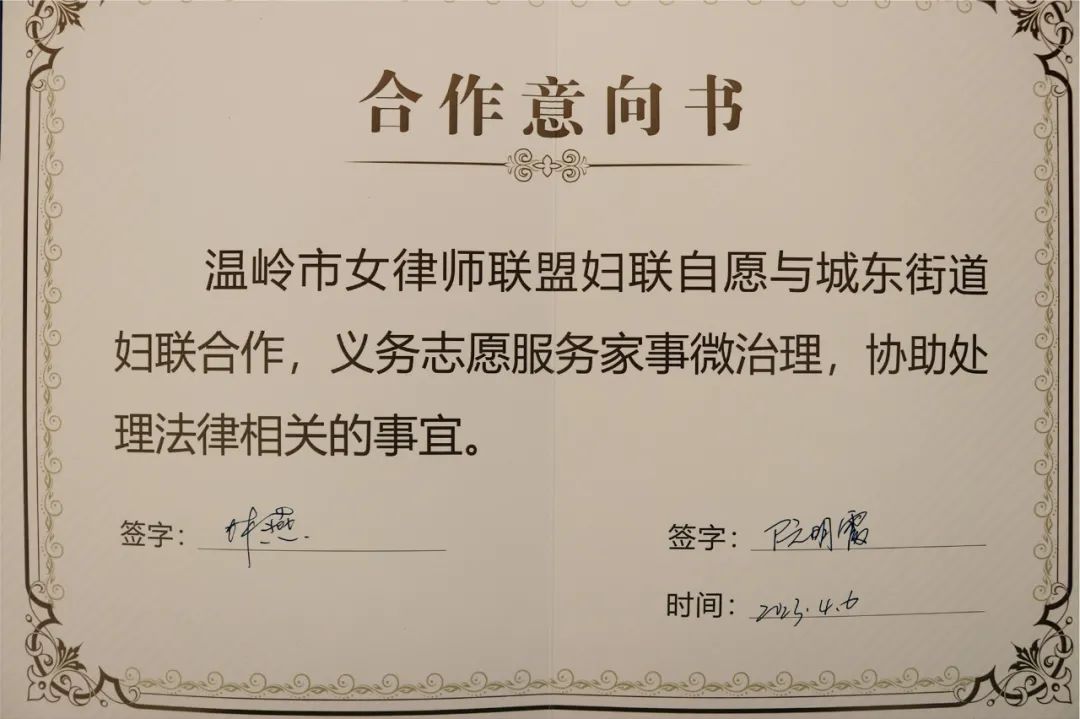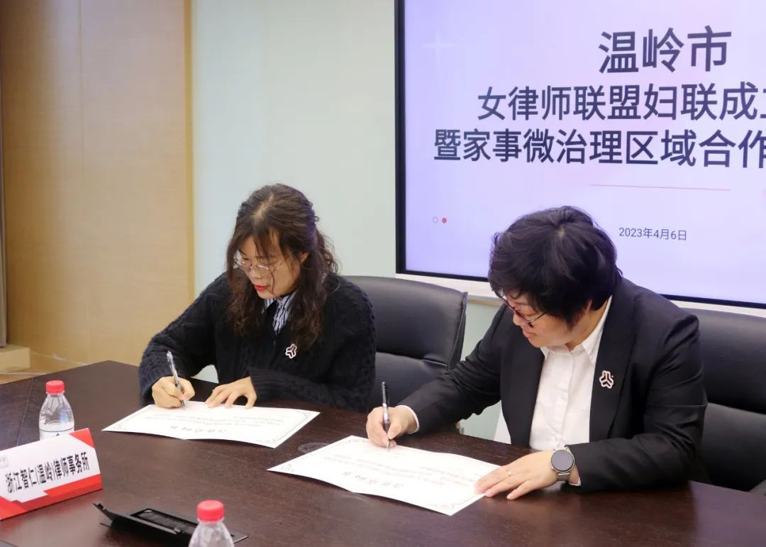 为充分发挥行业女性助力社会治理正面作用,浙江台州温岭汇聚全市女性律师,成立台州首个女律师联盟妇联,为家事治理提供“娘家人”精英力量。 温岭市女律师联盟妇联成立大会暨家事微治理区域合作启动仪式。 4月6日,温岭市女律师联盟妇联在城东街道揭牌成立。联盟妇联涵盖全市16家律师事务所,旨在通过妇联工作与律师行业的有效融合来创新妇联参与基层社会治理的新途径,充分发挥妇联组织在家事微治理,尤其是婚恋矛盾纠纷中的联系服务引领作用,以更好地为平安温岭建设融入新机制、注入新活力。 温岭市女律师联盟妇联在城东揭牌成立。 当天,女律师联盟妇联主席和城东街道妇联还签订了合作意向书,将义务志愿服务家事微治理,协助处理法律相关事宜。“我们联盟里的女律师经验都比较丰富,专业方向也比较细化,像财产纠纷、婚恋关系等问题,我们可以充分发挥自己女性情感丰富、心思细腻的优势以及专业特长,以柔克刚,帮助广大妇女家庭从源头上化解各类矛盾纠纷,筑牢全市的‘平安根基’。”温岭市女律师联盟妇联主席林燕说。 女律师联盟妇联和城东街道妇联签订合作意向书。 接下来,女律师联盟妇联成员将在城东街道家事微治理中心坐班“接单”,以集智聚力的形式,联合村社妇联、民间调解、司法调解等人员,为女性“娘家人”增添精英力量,从而解决婚恋纠纷等矛盾化解中的“法”“理”问题。 女律师联盟妇联和城东街道妇联签订合作意向书。 借助该联盟妇联,城东街道妇联还将进一步打造家事微治理中心,创新健全运行机制,让女性力量更好地参与社会治理,织细织密“横向到边、纵向到底、管理无缝隙”的女性家庭防护网。同时为了预防在家暴或者婚恋纠纷过程中产生民转刑事件,通过及时吸纳法治法律力量注入中心,以共同推动城东街道乃至整个温岭的社会治理更上新台阶。 女律师联盟妇联合影