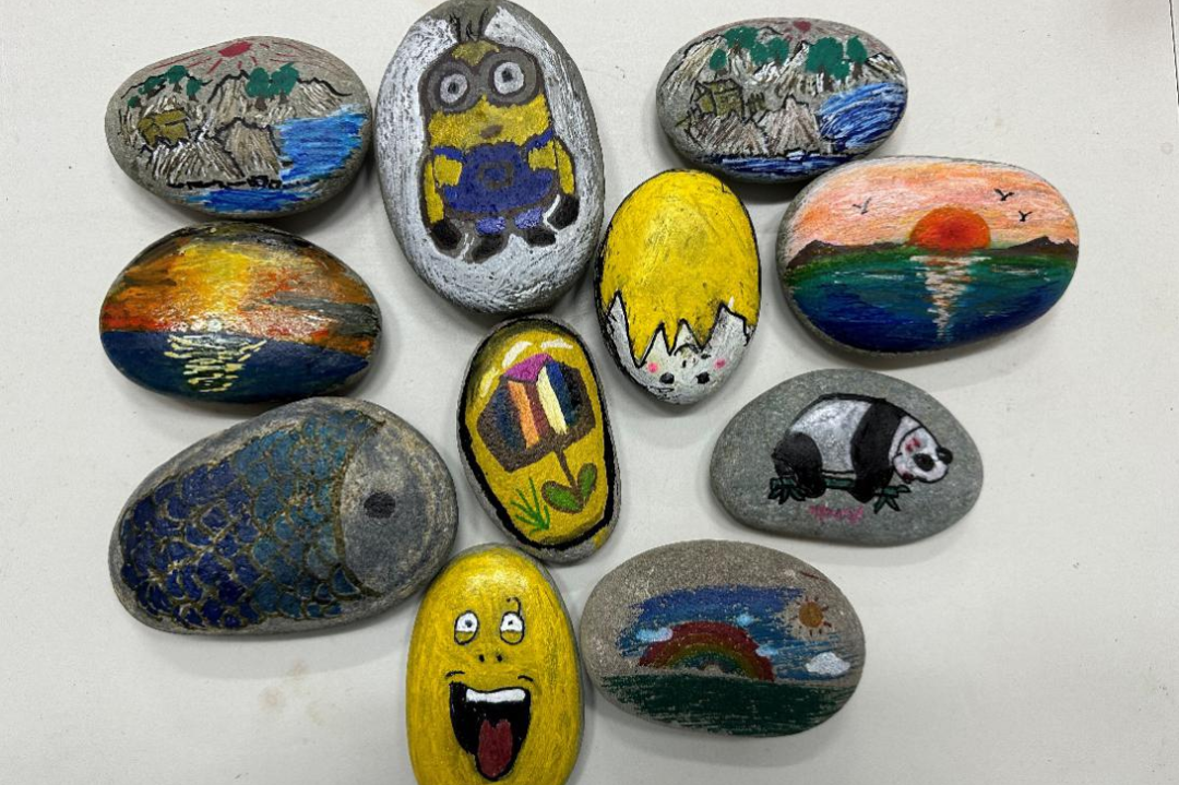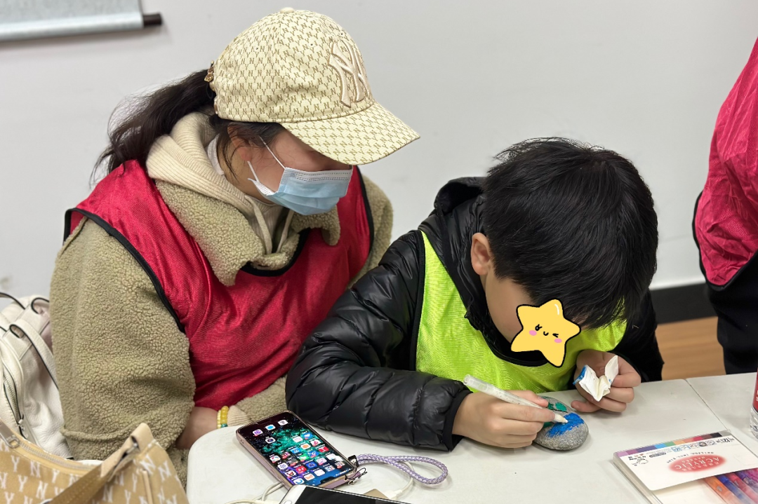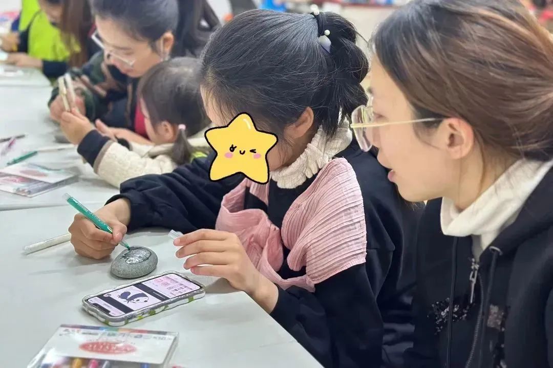 除了观赏石头,小朋友们也体验了一场别开生面的奇石手绘课。手绘活动现场,小朋友们人手一枚石头、一盒油彩笔。石头或圆或扁,或大或小,邻家妈妈和儿童一起构思创意,在邻家妈妈的鼓励和陪伴下,儿童耐心地完成自己的作品。