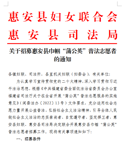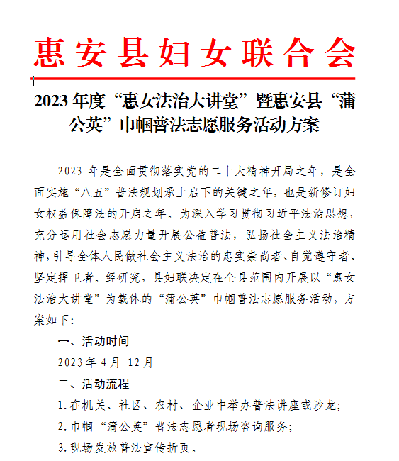 自今年3月1日启动惠安县“蒲公英”巾帼普法志愿服务活动以来,惠安县妇联凝聚“她”力量、贴近“她”需求、守护“她”权益,组织巾帼普法志愿者深入村(社区)、学校、企业、工业园区等开展普法宣传活动34场次,受益人数6000余人。 凝聚“她”力量,组建惠安县巾帼“蒲公英”普法志愿服务队伍 面向社会及机关事业单位招募44名热心公益的巾帼普法志愿者,她们中有来自法院、检察院、公安等部门的法官、检察官和人民警察,也有来自律所的法律服务工作者,还有基层工作经验丰富的村(社区)妇联主席、惠女调解员,她们传承弘扬惠女精神,以“娘家人”优势把法律知识化作“春风细雨”温暖每一位妇女。 贴近“她”需求,精心设置妇女儿童权益保护普法宣讲课题 围绕妇女儿童权益保护相关法律法规,特别是新修订妇女权益保障法,打造涵盖妇女权益保障、民法典、家庭教育、未成年人保护、防范化解民间借贷纠纷、预防电信诈骗、安全生产、禁毒、防性侵、幼儿交通安全、税收与生活等各类普法课题30多个,实现“基层妇联点单+县妇联派单”的点对点宣讲模式,让普法宣讲“飞入寻常百姓家”,确保群众对宣讲内容“听得懂、学得会、用得上”。 守护“她”权益,推动基层依法治理工作提质增效 发挥巾帼普法志愿者的专业优势,采取以案释法、有奖问答等方式,对妇女群众关心的子女抚养、财产纠纷等法律问题进行解答,引导她们合理利用法律途径解决诉求。此外,还为妇女群众送上“坚持男女平等基本国策”宣传袋、《妇女权益保障法学习问答》《家庭教育促进法十问十答》等法治“大礼包”,奉上温暖贴心的关怀和法律服务帮助,着力提升妇女群众法治获得感和幸福感。 下一步,惠安县妇联将继续深入推进“八五”普法工作,让“蒲公英”的触角乘着志愿普法的劲风,将法治精神的“种子”播撒到妇女群众的“心田”, 让法律知识“接地气”,让普法活动“有人气”,在全社会营造浓厚的法治文明氛围。