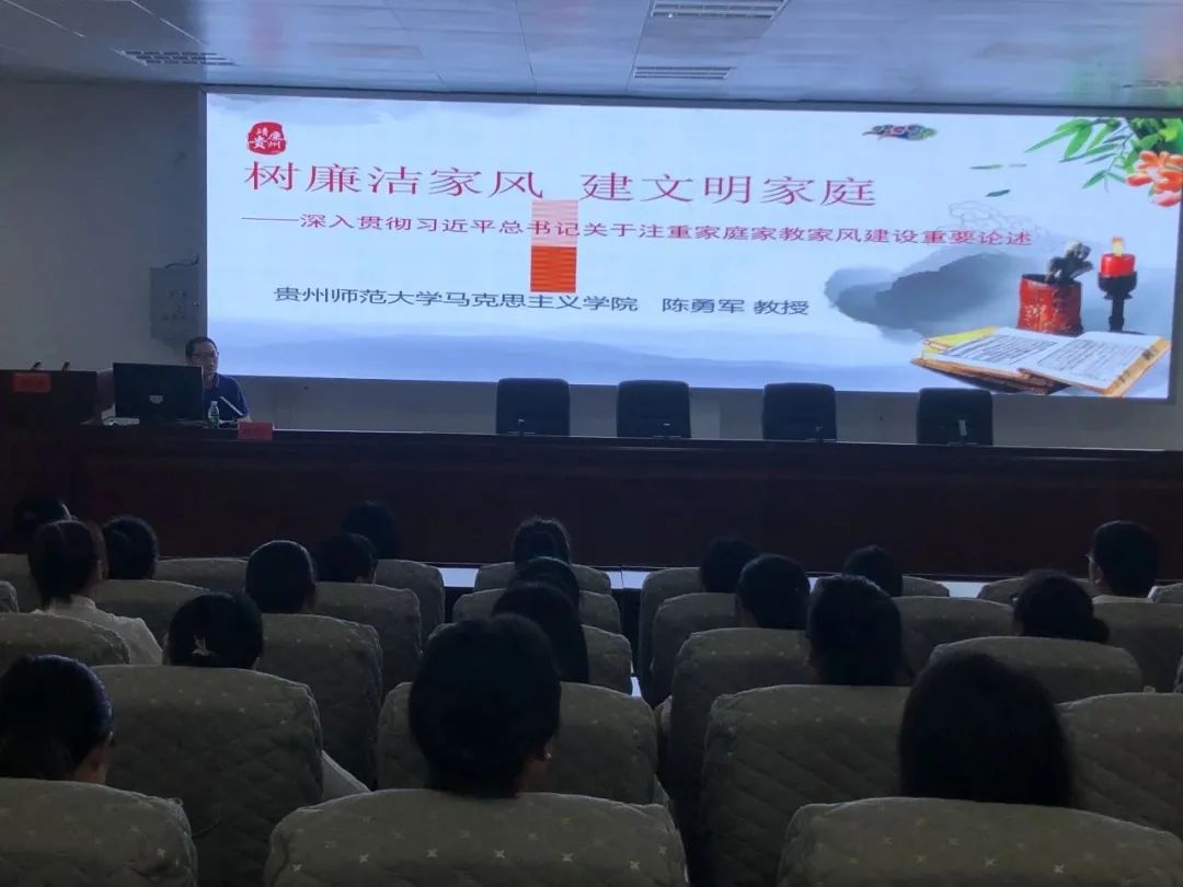 铜仁市家庭教育协会秘书长杨敏见从什么是家风、树立家风的重要性、怎样建设好家风、正家风促党风等方面进行讲解,深入浅出地诠释了家风、家训、家规的涵义,引导参会的领导干部家属牢固树立新时代家庭观,树牢清正廉洁、勤俭朴素的良好家风,营造健康向善的家庭氛围,争做廉洁家风的建设者。