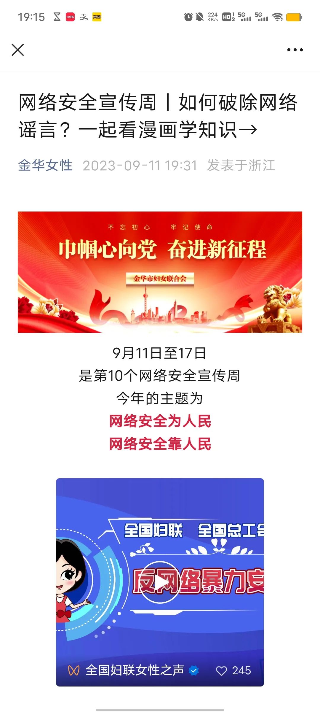 2023年9月11日至17日是第十个国家网络安全宣传周。为了进一步增强全市妇联干部、妇女儿童和家庭的网络安全意识,提升基本防护技能,营造安全健康文明的网络环境,金华市妇联系统围绕“网络安全为人民 网络安全靠人民”主题,开展形式多样的“个人信息保护日”系列宣传活动。 01积极参与网络安全主题市集 与金华市委网信办、市经信局、市教育局、市公安局等部门在金华铁路文化公园共同举办“网络安全为人民 网络安全靠人民”2023年金华市网络安全宣传周启动仪式。积极参与金华市网络安全主题市集,现场发放网络安全宣传册,各种宣传品500余份。 02开办线上网络安全宣传专栏 在网络安全宣传周期间,充分发挥金华女性微信公众号等新媒体账号,开设网络安全宣传周、巾帼反诈课堂等专栏,宣传《网络安全法》《数据安全法》《个人信息保护法》等网络安全领域法规,发布《网络安全宣传周 | 如何破除网络谣言?一起看漫画影知识——》等有关推文,利用漫画、视频、直播等形式,聚焦妇女姐妹日常生活,切实提高妇女姐妹网络安全防范意识和个人信息保护能力。全市妇联系统微信公众号累计推出网络安全推文40余篇。 03开展线下网络安全知识普及 市县乡村四级妇联组织充分发动全市“一格一姐”巾帼志愿者进机关、进校园、进社区、进网格、进农村,通过开展主题宣传活动、组织巾帼大宣讲、设置宣传点位、LED展播宣传标语、走街入户等方式普及网络宣传知识,将网络安全宣传知识送进千家万户,为平安金华建设贡献巾帼力量。全市妇联累计开展活动240余次,发放“争做巾帼好网民”倡议书及个人信息安全保护宣传手册等资料5万余份。 兰溪市妇联与兰溪市市委网信办、市公安局,在兰溪市宝龙广场1号门开展网络安全周广场宣传活动。 各级妇联针对学生、妇女、老人等不同群体开展宣传,通过微信群、室外电子屏滚动播放、举办讲座、面对面宣传多形式开展集中开展网络安全宣传教育活动。 04开展网络安全知识竞赛 积极组织发动各级妇联干部、妇女、家庭参与省网信办、省妇联和省总工会举办的浙江省网络安全宣传周知识竞答,引导广大妇女和家庭主动学习网络安全知识,加强网络安全自我保护意识。 通过开展此次“网络安全宣传周”活动,不仅增强了基层妇联干部的网络安全防范意识,也让广大群众了解到"依法上网、文明上网、安全上网"的必要性,营造了网络安全人人有责、人人参与的浓厚氛围,对打造安全、健康、文明的网络环境起到积极的推动作用。