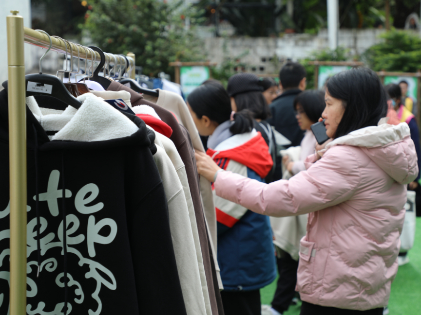 爱心义卖现场气氛热烈,群众接踵而至。大家纷纷拿着衣服比划,互相讨论。“这件也太好看了吧!”“这件还有码数吗?”“买到就是赚到啊!”“义卖捐款是做好事,我要多买一些。”