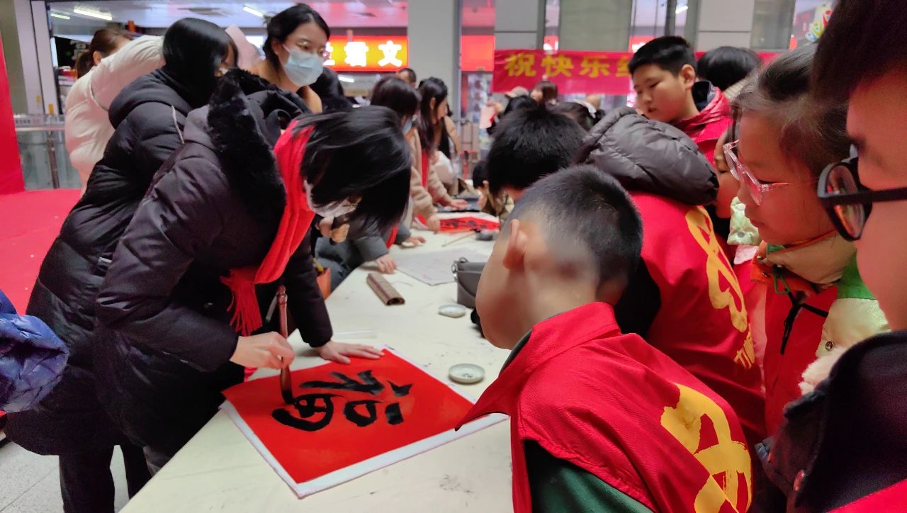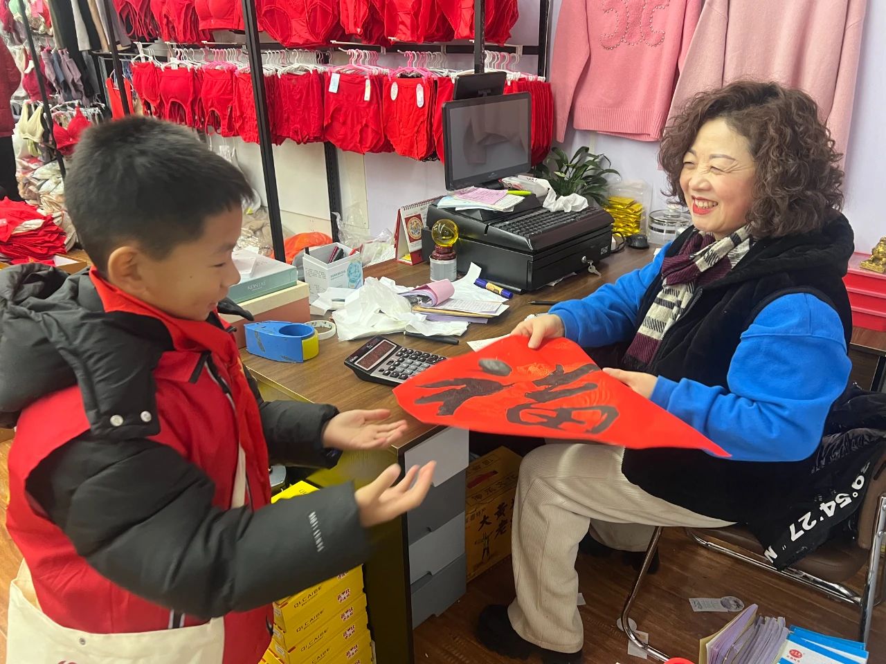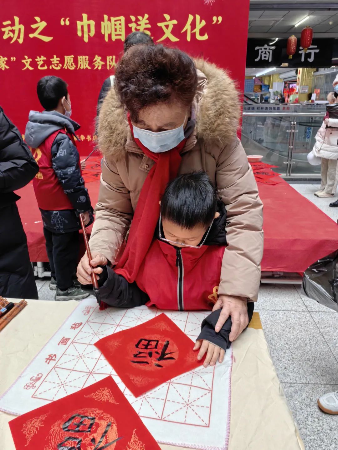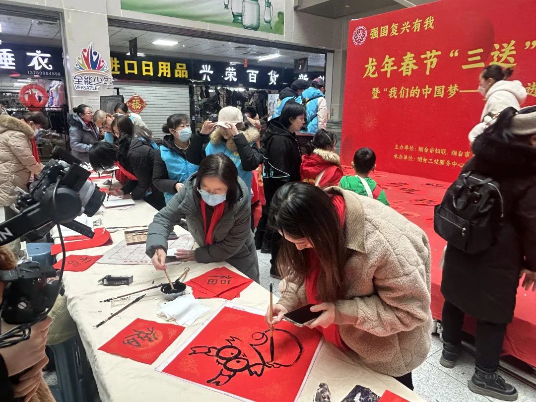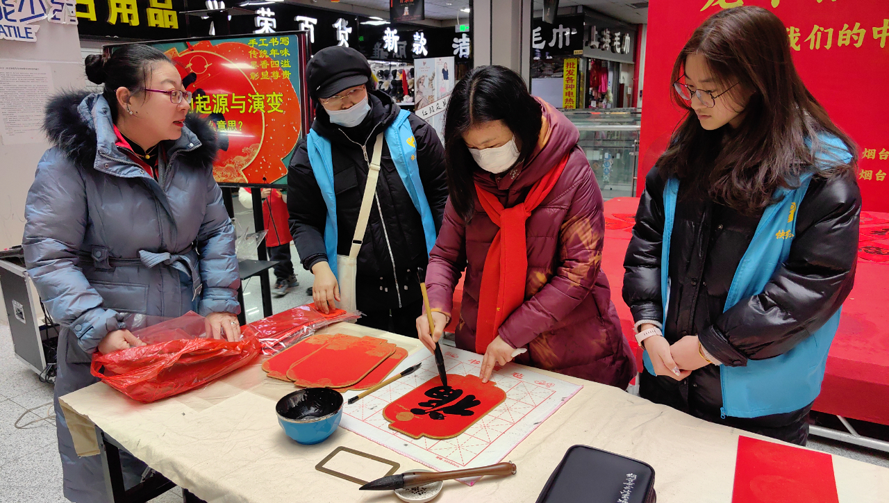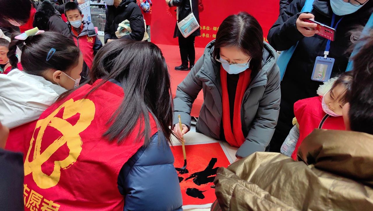 立春时节,烟台三站小商品市场里翰墨飘香、年味十足。龙年春节烟台妇联“三送”行动之“巾帼送文化”暨“我们的中国梦——文艺进万家”文艺志愿服务队走基层活动在这里举行。 活动由市妇联、市文联主办,三站服务中心、三站股份有限公司、烟台市书法家协会、烟台新华书店、快乐红心巾帼志愿阳光站承办。女书法家、绘本阅读指导师与100余名小小志愿者和家长共同学习春节习俗,并进行写“福”字、向三站商户赠送“福”字活动。 “南宋时期的《梦粱录》里就有‘贴春牌’的记载,也就是说,春节贴福字的习俗,到现在至少有750年了。”烟台新华书店绘本阅读指导师“桐桐姐姐”声情并茂地为孩子们讲解春节由来和习俗。 “孩子们,刚刚我们讲了‘年兽’的故事,咱们身上就有一样‘年兽’非常害怕的东西,是什么呢?” “我知道!”“是红马甲!””我穿着呢!“ 孩子们争先恐后举手抢答、积极互动,在寓教于乐中把优秀传统文化牢记在心。 女书法家教孩子们写福字,从上到下、从左到右依次为省书法家协会会员、市书法家协会会员刘惠芬,中国书法家协会会员、市书法家协会副主席宫庆全,省青年书法家协会会员、市书法家协会会员柳沣圃,烟台印社理事、市书协会员、市老年大学书法教师姜芳芳,中国硬笔书法协会会员、市书法家协会会员姜婧婧 接下来的写福字环节,5位女书法家挥毫泼墨,或端稳厚重、或飘逸灵动,如行云流水,百余张各种书体的福字写就。 “笔要立起来,不要着急,慢慢来。”在女书法家们手把手的指导下,小小志愿者聚精会神、运笔着墨,一个个稚嫩的福字,是孩子们对春暖花开、福暖万家的纯真祈愿。 为了激发孩子们对书法的兴趣,女书法家们将书法与漫画结合,专门书写了一系列卡通福字、龙字,受到热烈欢迎。“除了福字,我们还写了读书、立志、奋进等红色福卡,可以悬挂在巾帼志愿阳光站,让孩子们时时感受到书法之美,增强文化自信。”中国书法家协会会员、烟台市书法家协会副主席宫庆全表示。 “阿姨您好!这是书法家写的福字,祝您新春快乐!”“叔叔,福字送给您,给您拜早年!”小小志愿者火红的身影在三站小商品市场穿梭,把一个个刚写好的福字送到商户手中。一声声纯真的祝福,一句句真挚的感谢,使热闹的“年货大集”增添了喜悦和温暖。 “好多来采购的市民受到感染,带着孩子参与进来,我们更有干劲了。”快乐红心巾帼志愿阳光站负责人刘清表示,将进一步响应各级妇联号召,发挥好巾帼志愿力量,发挥阳光站建在商圈的优势,打造更多寓教于乐的项目,带动更多孩子和家长在“沉浸式”体验中让“赠人玫瑰 手有余香”的理念成为家风,让社会主义核心价值观随家风代代相传。
