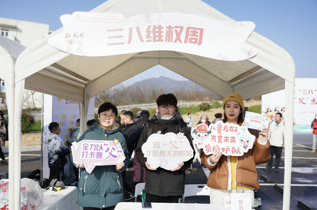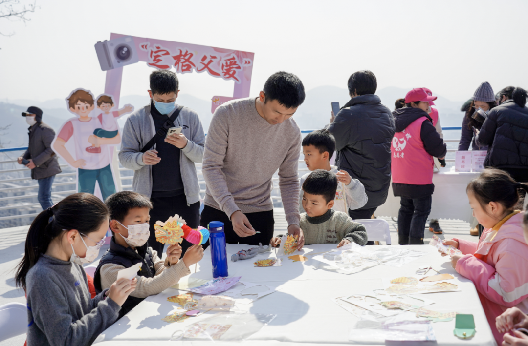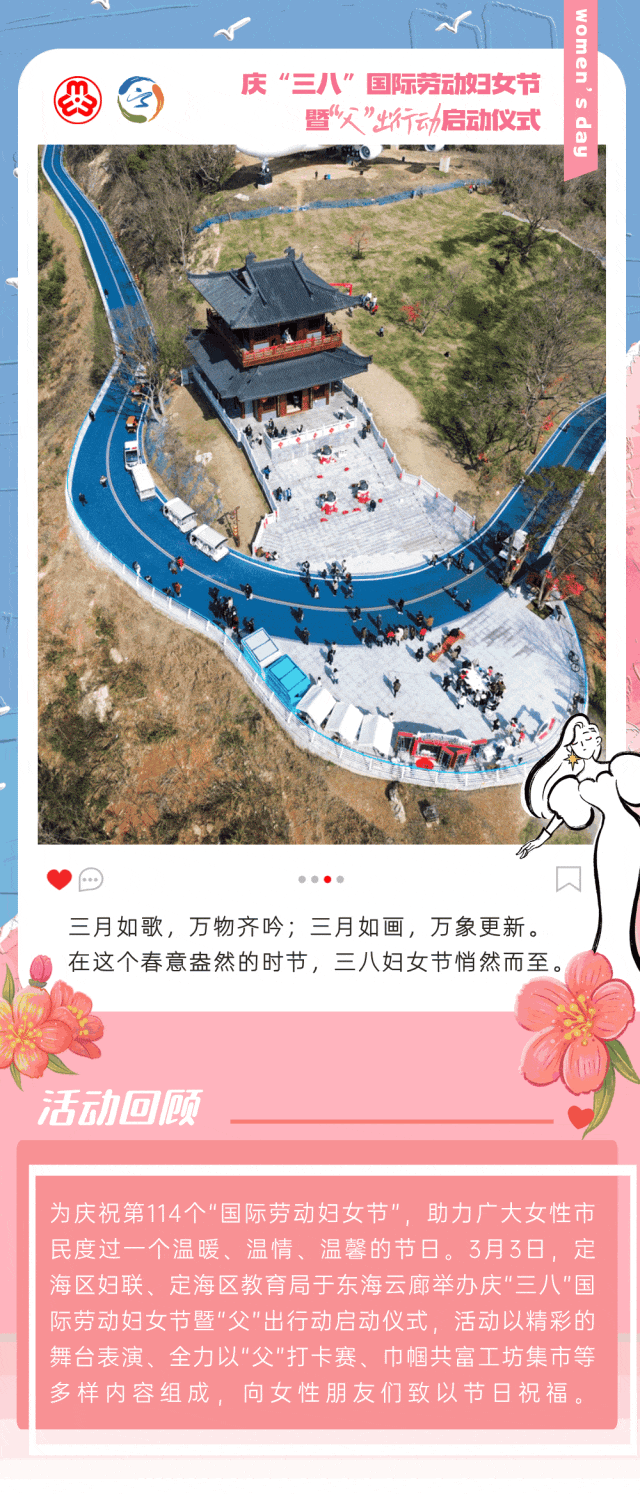 巾帼集市美食飘香,打卡赛沿途欢声笑语...在远眺古城风光的东海云廊上,亲子家庭们边赏景边游玩,完成了一场温馨的山海之约。 用镜头来回顾每一个熠熠生辉的美好时刻。 庆“三八”,为爱“父”出 为进一步加强对家庭教育工作的管理和指导,深化精神文明创建,助力舟山市儿童友好城市建设,定海区妇联积极探索“父职教育”新模式,在妇女节来临之际,通过启动“父”出行动系列活动,唤起社会对父职教育的关注,让更多的父亲参与到家庭教育中,缓解女性在家庭生活中的压力。 3月3日上午,一段欢腾的舞龙舞狮表演,拉开了“父”出行动启动仪式的帷幕,表演者们手持鲜花,迎接来往的女性游客,送出惊喜与祝福。 “兼山海之胜,融文化之美”,本次活动地点位于自然风光与人文底蕴交相辉映的东海云廊擂鼓山段,定海区巾帼红促进会代表通过深情并茂的诗朗诵《云廊赞》,为东海云廊献上真挚赞歌。 启动仪式上,定海区委副书记、政法委书记江舟为本次活动致辞,向在场女同胞们表达了节日的祝福,希望通过“父”出行动的逐步开展,倡导更多的父亲主动参与孩子的教育之中,解放妈妈时间,唤醒父教责任,推动定海区家庭教育高质量发展。 随后,舟山青年越剧团“海岛梨园”少儿越剧团带来精彩的演出《五女拜寿》,优美易懂的唱词,悠扬婉转的唱腔,清雅脱俗的扮相,引得市民朋友掌声雷动。 伴随着激昂的音乐,定海区委副书记、政法委书记江舟,舟山市妇联副主席蒋肖琛,定海区妇联主席黄燕,定海区教育局党委副书记王帮贤,定海区昌国街道党工委副书记杨凌锋一同上台,宣布“定”有好爸·“父”出行动正式启动。 游云廊,全力以“父” 三月暖阳照,女神踏春来。活动现场新老妇联干部、女企业家、优秀女性社会组织代表同游东海云廊,共聚巾帼力量,度过意义非凡的节日。 活动现场除了能看到妇女朋友们相约同行,更有爸爸们带领照顾着孩子、妈妈陪同走上云廊步道,一家人打卡沿途游戏的场景。 “今天只能爸爸来签到哦,妈妈负责貌美如花就行。”“爸爸来陪你做游戏,我们不让妈妈操心!”在现场“父”出行动的号召下,爸爸们展现着与孩子间的温馨互动,在和煦的暖阳中,不断升华着亲子之情。 文化点睛,山水入心。行走在以“崇文重学”为主题的擂鼓山段,缓缓上坡,亲子家庭们边走边看边玩,沿途纷纷打卡了“龙年吉语”emoji成语猜猜乐、“魔法汉字”拼拼乐、“福瑞好运·连中三元”投投乐等趣味游戏,朝着状元阁的方向漫步行走。 全力以”父“打卡赛的终点,就在这条“状元古道”的状元阁。完成沿途种种游戏打卡抵达终点后,孩子们还可以坐下和家长们一起动手,做一条颇有年味的“如意翻翻龙”带回家,最后来一张温馨的合影,定格此刻美好的瞬间。 参加活动的父亲表示,平时因为工作忙碌,很难得有这样的机会跟孩子相处这么长时间,也发现了孩子身上很多之前没有发现的特点,更加了解了孩子,也体会到了女性同胞带娃的不容易。 通过这样的挑战,亲子之间对彼此有了新的认识和了解,更加紧密了亲子关系。 逛集市,展巾帼魅力 云廊漫步途中还有着特殊的“补给站”。10家来自定海区的巾帼共富工坊集市齐聚云廊,纷纷出摊,吸引现场参与活动的亲子家庭、市民朋友们驻足消费。 精美的刺绣手作、渔绳结饰品,虾干、水磨年糕、金塘麻饼、年糕片、杨梅干......巾帼共富工坊集市好物云集,展现出了新时代女性的绚丽风采,绽放健康向上的女性活力,凝聚巾帼力量。 本次庆“三八”国际劳动妇女节暨“父”出行动启动仪式圆满举行,下一步,“父”出行动将结合定海区文化特色,把自然教育、文化教育、趣味游戏相融合,以沉浸式体验研学的活动方式,邀请父亲与孩子们共同参与,引导父亲们更好地担任起家庭教育的责任,探索“父职教育”的更多实践,推进舟山市儿童友好城市建设。