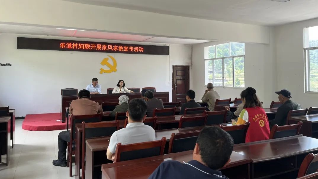 武陵山乡乐道村妇联在村会议室开展家风家教宣传活动。