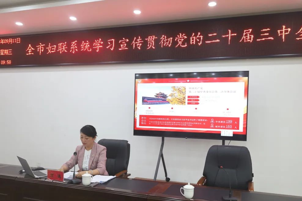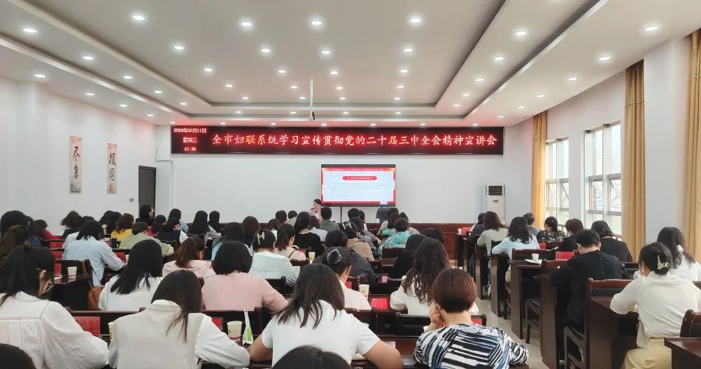 9月11日上午,为深入学习宣传贯彻党的二十届三中全会精神,引导全市广大妇女群众和妇联干部统一思想、凝聚巾帼共识,以实干实绩推动全会精神在全市妇联系统落地生根,贵州省六盘水市妇联系统举行学习贯彻党的二十届三中全会精神集中宣讲会。 市委宣讲团成员,市妇联党组书记、主席万漓以《深入学习贯彻党的二十届三中全会精神,为推进中国式现代化幸福六盘水实践贡献巾帼智慧和力量》为题,围绕“深入学习领会全会胜利召开的重大意义、深入学习领会习近平总书记在全会上的重要讲话精神、全面准确理解《决定》提出的进一步全面深化改革重大举措、奋力推动全市妇女儿童事业高质量发展”四个方面,对照全会提出的进一步全面深化改革系统部署,立足妇联实际怎么干,结合妇联职责如何抓落实,进行系统阐释和宣讲。 宣讲会指出,党的二十届三中全会是在以中国式现代化全面推进强国建设、民族复兴伟业的关键时期召开的一次十分重要的会议,对进一步全面深化改革、推进中国式现代化作出的系统部署,既是党的十八届三中全会以来全面深化改革的实践续篇,也是新征程推进中国式现代化的时代新篇,具有重大意义。 宣讲会号召,全市各级妇联组织要提高政治站位,坚定拥护“两个确立”、坚决做到“两个维护”,深入学习、深刻领会、全面把握,把思想和行动迅速统一到全会精神和省委决策部署上来。突出政治引领,在“为什么改”上深化认识。从战略和全局的高度,深刻认识进一步全面深化改革的重要性和必要性,深刻领会党中央对妇女儿童、家庭建设和群团工作的新要求,增强政治自觉、思想自觉和行动自觉,主动融入全国、全省改革发展大局服务。坚持党的全面领导,在“改什么”上找准着力点。结合我市妇联工作实际找准结合点和切入点,聚焦突出问题推动妇联改革向纵深发展,不断增强妇联组织的政治性、先进性、群众性,以妇女儿童和家庭的获得感、幸福感、安全感检验妇联改革成效。勇担使命任务,在“怎么改”上抓好责任落实。吃透改革精神,把牢正确方向,分层分类开展“巾帼大宣讲”,强化妇女思想政治引领,凝聚改革共识;坚守“改革为民”立场,精准发力抓好涉及妇女儿童和家庭改革任务落实;充分调动各级妇联组织和党员干部抓改革、促发展的积极性主动性创造性,凝心聚力为推进中国式现代化幸福六盘水实践贡献巾帼智慧和力量。 市直机关事业单位及高校妇委会(妇联)主任(主席),各市(特区,区)妇联主席,三八红旗手、巾帼建功标兵、最美家庭等先进典型代表,“三新”领域妇联组织代表及市妇联干部职工、离退休干部代表等百余人参加会议。