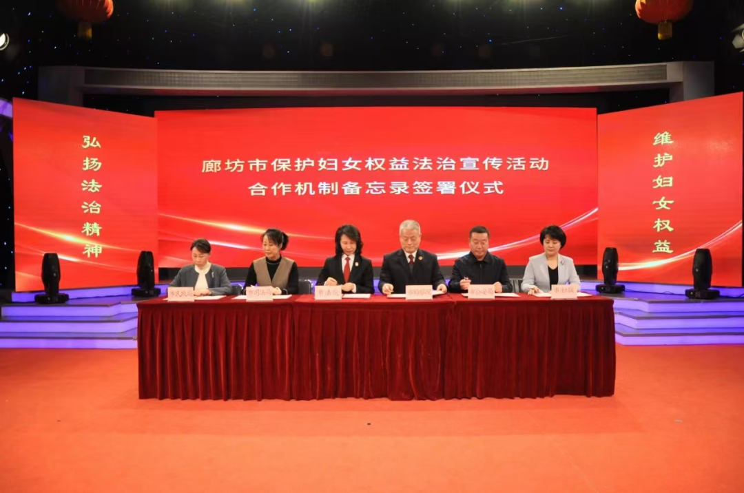 廊坊市妇联联合市委政法委等六部门共同举办“巾帼普法行 共筑幸福梦”廊坊市保护妇女权益法治宣传活动,以讲述普法故事、创作法治节目、诗朗诵、签署合作机制备忘录等形式,推进妇女普法维权工作深入开展,为妇女提供更加优质的法律服务。
