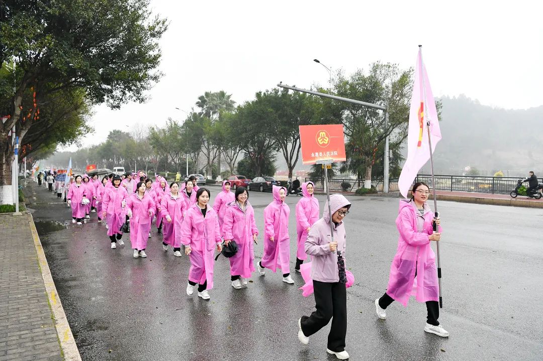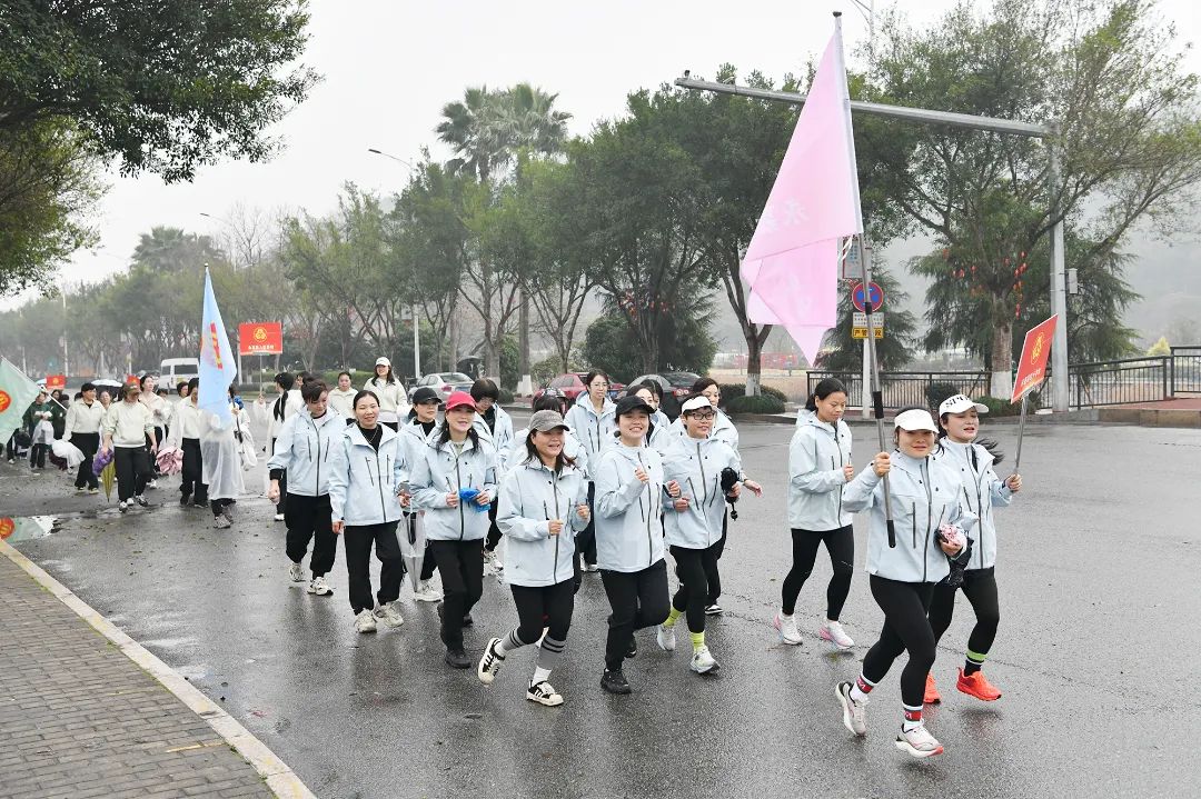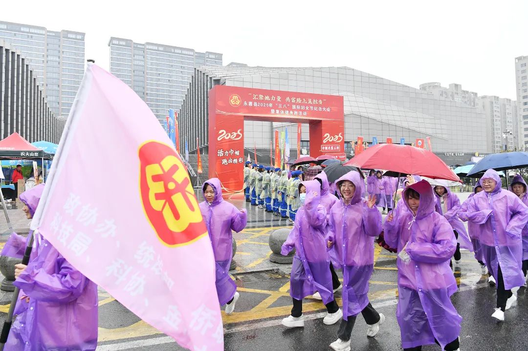 3月3日上午,浙江省温州市永嘉县举行“汇聚她力量 共富路上显担当”2025年“三八”国际妇女节纪念大会暨集体健身跑活动。本次活动由永嘉县妇联、县文广旅体局、县总工会和团县委联合主办。县领导黄金锡、周旭丹、汪金琰、陈文平、郑碧碧、朱佩珍出席活动。 活动首先对获得全国三八红旗集体、浙江省巾帼建功标兵代表进行了表彰。县妇联主席林雪艳向全县妇女同胞致以美好的节日祝福,并希望全县广大妇女姐妹们永葆“奔跑者”的本色,争当“红旗手”、擎起“半边天”,在强城共富路上勇往直前。 县委副书记、社会工作部部长、政法委书记黄金锡指出,今年是“十四五”规划收官之年,也是永嘉奋力谱写中国式现代化新篇章的关键时期。希望广大妇女同志始终淬炼政治品格,在永葆赤诚初心中锻造巾帼忠诚;始终勇立时代潮头,在服务发展大局中彰显巾帼作为;始终润泽文明沃土,在引领时代新风中贡献巾帼智慧;始终锤炼过硬本领,在自我革新突破中展现巾帼风采。 随后,来自全县各机关、企事业单位、社会团体的近1000名女性分成71支巾帼队伍,从县体育馆开跑,虽然天公不作美下起了雨,但是她们依旧步伐坚定,溅起的水花好似奋进的音符,奏响了一曲无畏风雨的巾帼赞歌。她们用汗水诠释着拼搏,用坚持彰显着力量,让 “巾帼不让须眉” 的风采在风雨中熠熠生辉,也让整个县城弥漫着昂扬向上的气息 。