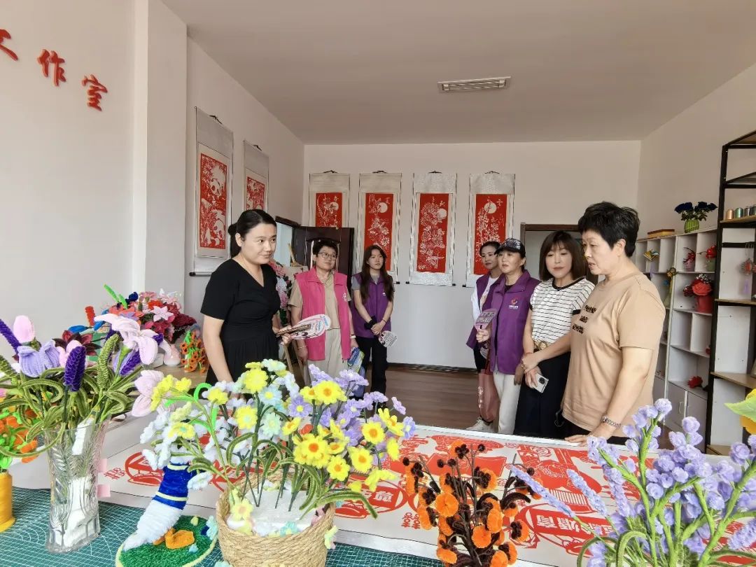 在龙江巧女幸福工作室,调研组查看工作室设施与手工作品,了解材料采购、创作流程,肯定其通过免费培训、集中创作带动社区女性居家就业的成效,促成其与市妇联手工编织基地合作,并建议拓宽销售渠道、丰富培训内容,推动手工艺品与旅游融合。
