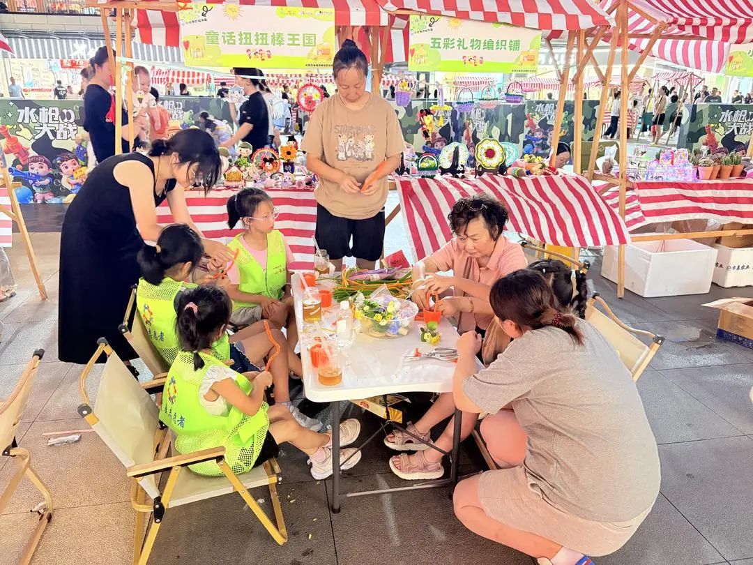 激情水战后,“杂物寻新主·爱心接力摊”更显人气。浑身湿漉漉的小掌柜们干劲十足:“水枪战补充能量,旧玩具换新家!”而“无声摊位”的彩绘麻布袋在灯火下静静绽放,与不远处“星星烤箱的魔力派对”飘来的甜香交织,诠释着多元参与的社区温度。 “我的饰品我做主”工坊里,水珠还挂在发梢的孩子们已专注串起彩珠;“五彩礼物编织铺”的丝线在湿润的小手中穿梭成网。空气中弥漫着创造的快乐,每个孩子都是自己童话的主角。