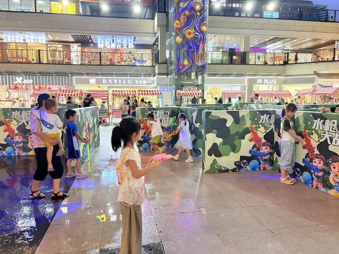 集市高潮在印乐集商圈特别安排的儿童水枪大战中点燃。当主持人哨声响起,孩子们手持水枪欢呼涌入中央战场。晶莹水柱划破暮色,广场瞬间升腾起彩虹水幕。小勇士们灵活穿梭在充气掩体间,欢叫声与水花声汇成夏日交响曲。工作人员贴心准备的防水围挡外,家长们举着手机记录这份酣畅淋漓的童年野趣,连路过的居民都驻足笑叹:“这才是夏天该有的样子!”