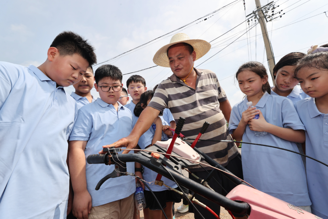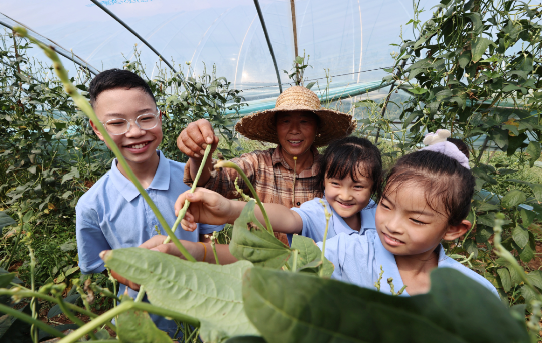 农耕体验环节,孩子们走进田间地头,跟着农户、巾帼志愿者们学习磨豆浆、摘豆角,辨果蔬、识农具,体验农耕乐趣。