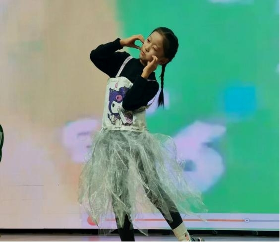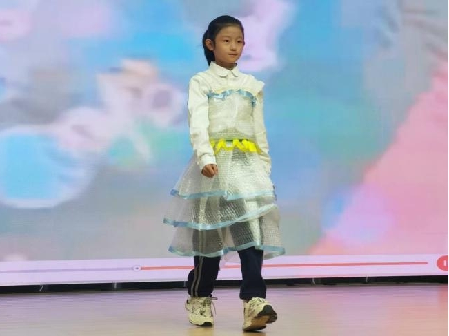 学生穿着自制“再生衣”闪亮登场,一场创意十足的时装秀,把环保与时尚完美融合,赢得全场掌声。