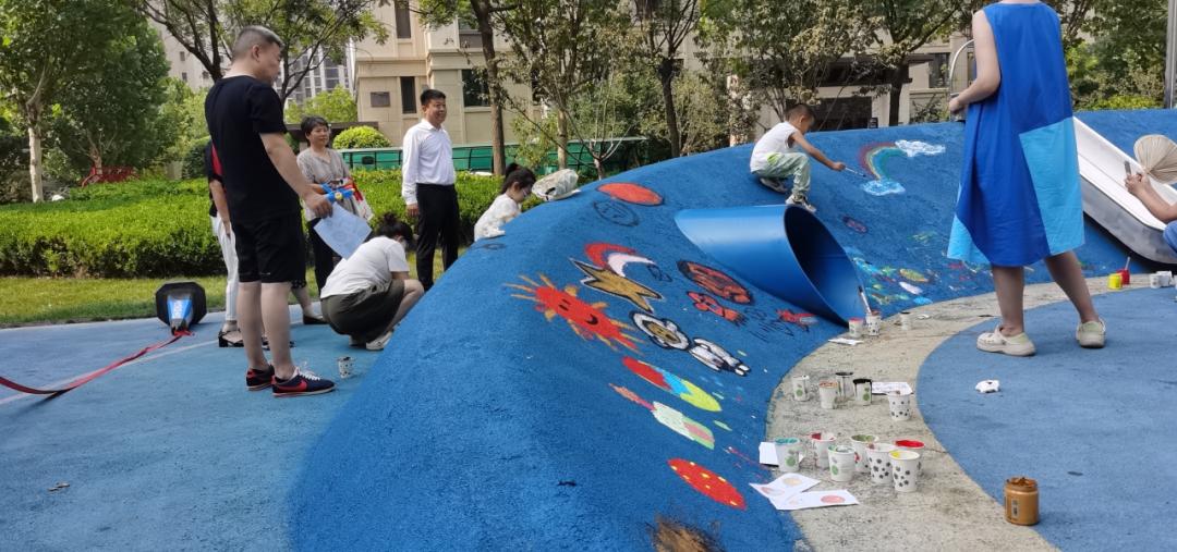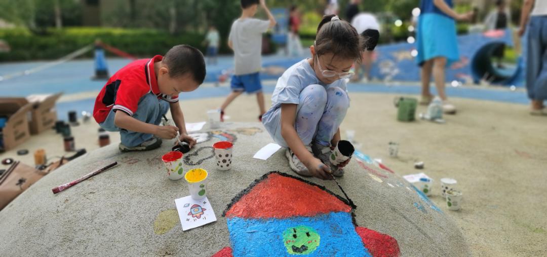 因地制宜充分利用现有的儿童空间,打造“一米”场景。御龙湾社区现有室外游乐场2个,分区域采取适儿化打造自然体验、锻炼、互动游憩等多场景的活动场地。室外通过让儿童自己装扮的方式,用鲜艳的色彩及充满童趣的图形标布满整个游乐场。室内根据需求化定位活动空间,动静结合,在设计中融入科学知识、文化传承等教育元素,划分了书香会客厅,墨香会客厅,启慧科普小屋,社区自习室等,为儿童提供充足的活动空间,并因地制宜发挥重要作用,常态化开展书法、绘画、科学小实验等活动。