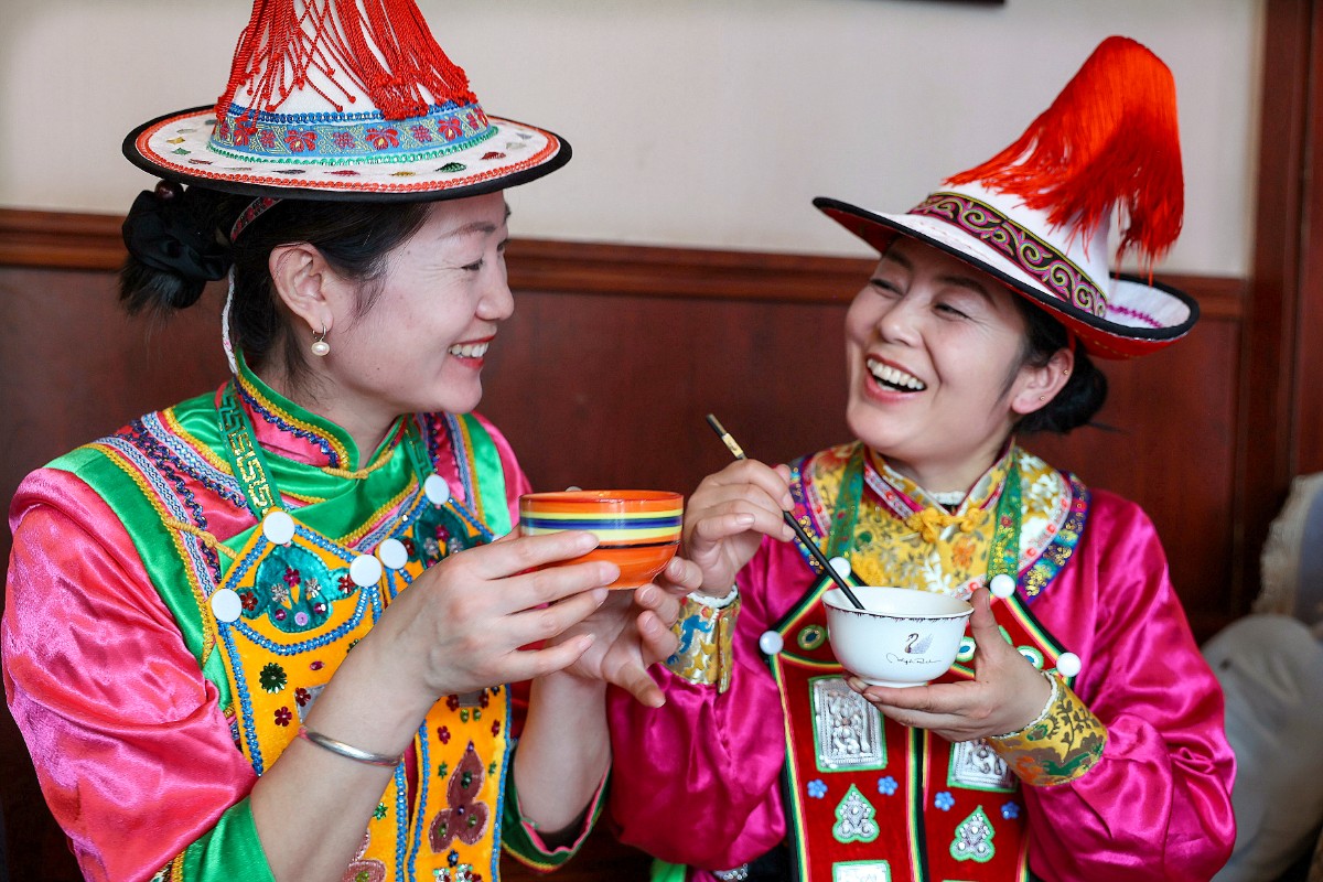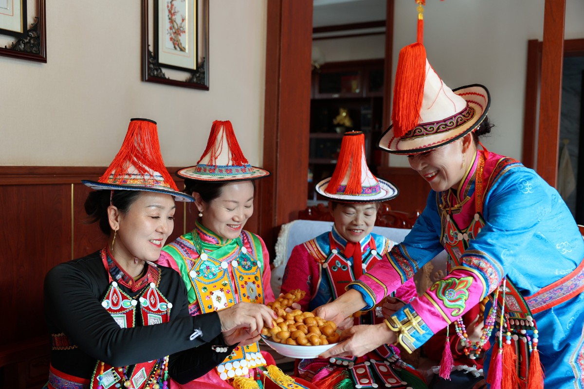茶几前,一碗碗热气腾腾的酥油茶香气四溢,金黄酥脆的炸馍摆满盘中。姐妹们围坐在一起拉家常、话新春,举杯互送祝福,浓浓的年味在茶香与笑语中缓缓流淌。