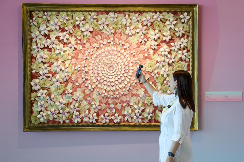 10月13日,一名外国女记者拍摄全球妇女峰会女性主题特展“华韵承芳·非遗共赏”。新华社记者 梁旭 摄